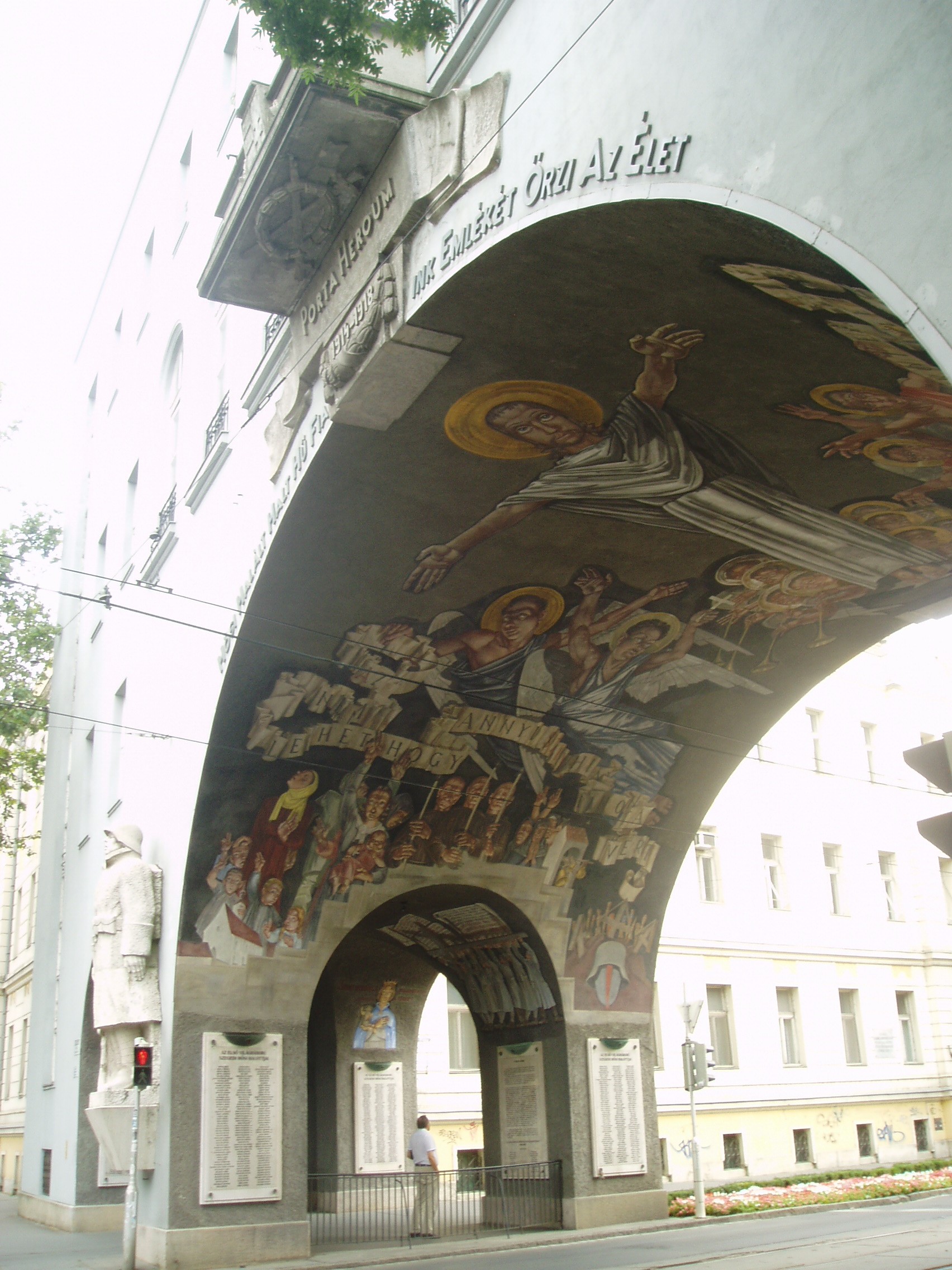 Nyilvános 1092 | 1593 | Szeged, Aradi vértanúk tere: Hősök kapuja | Az Aradi vértanúk tere déli oldalát a nagyszabású Hősök kapuja (Porta heroum) határolja. Az 1936-ban Pogány Móric tervei szerint épült kapu épült kapu honvédszobrai - az élő és a halott katona - Lőte Éva 1937-ben készült alkotásai, s az I. világháború áldozataira emlékeztetnek. A boltív freskóit Aba-Novák Vilmos készítette. A festményeket 1949-ben levakolták, csak a Millenniumra sikerült feltárni és helyreállítani őket. A művész a képsorozaton három témát jelenített meg: a háborús emlékezést, a hősi halottak dicsőítését és Horthy Miklós elindulását Szegedről. Középen, fejjel a tér felé Aba-Novák az ítélkező Krisztus mintegy 8 méteres alakját ábrázolta, lábainál a harsonás, ítélkező angyalok csoportjával. A kapu alatt kezdődik a nagyállomásra vezető Boldogasszony sugárút. A fénykép 2007 júliusában készült. Felh. irod.: www.vendegvaro.hu |
