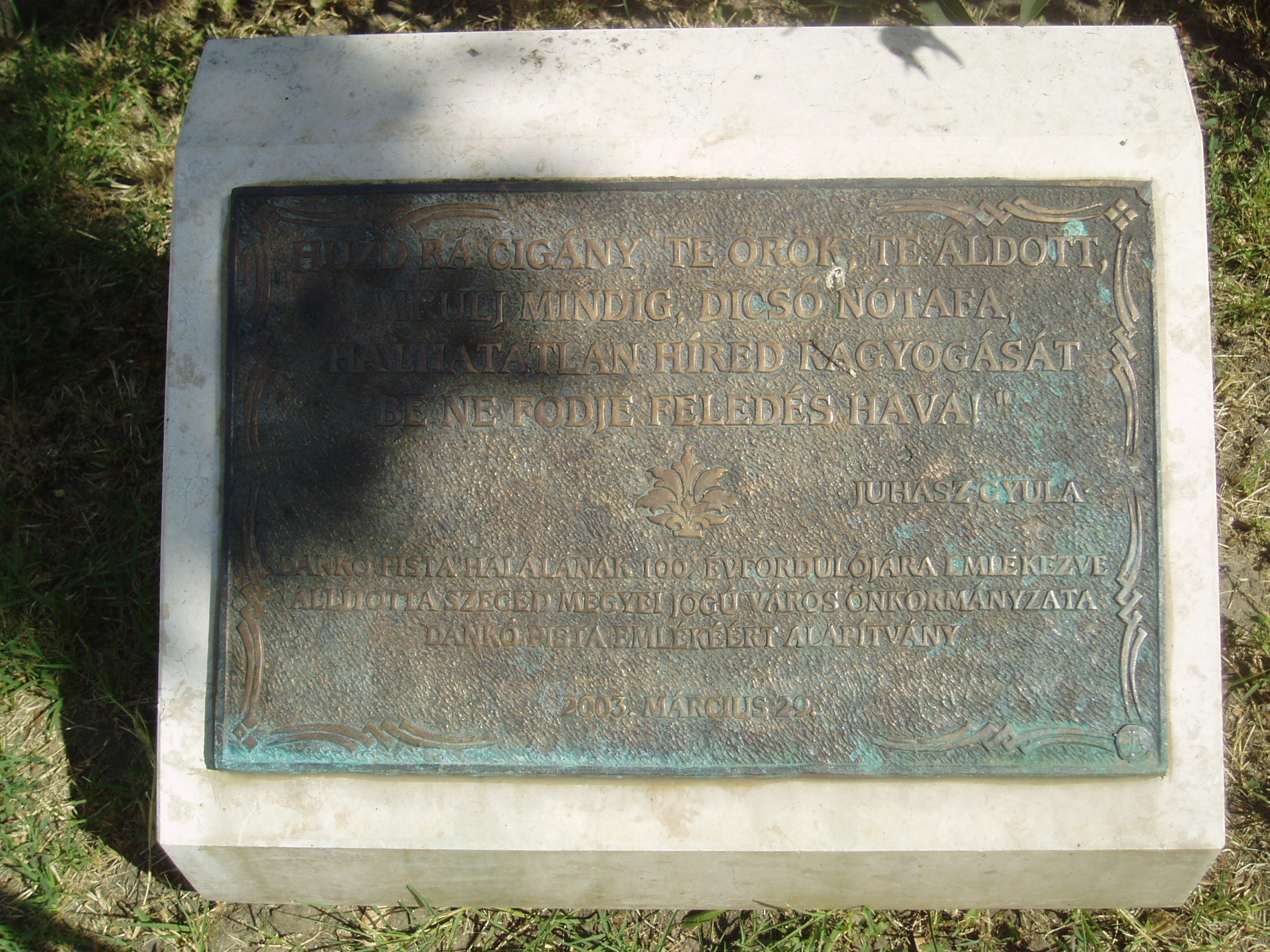 Nyilvános 1079 | 1660 | Szeged, Arany János utca 2. Dankó Pista szobra | Az egykori Kass/Hungária szálló előtt áll Dankó Pista lírai szépségű, romantikus szobra, Margó Ede 1912-ben felavatott alkotása (eredetileg a a Stefánián állították fel, a Tisza-parthoz közeli részen, a színház bejáratának tengelyében). A monolit jellegű, egy darabból faragott szobor markáns festői hatásokkal fejezi ki a dalköltő lelkének mélységeit. A hegedűjét pengető, elmélázó nótaköltő mögé a szobrász nyíló vadrózsabokrot mintázott, vésője nyomán csipkefinom részletek és nagy felületekben lágyan elomló formák teremtik meg a szobor mélabús hangulatát. A nevezetes szobor történetéhez hozzátartozik az a tréfás szegedi anekdota, amely szerint a dalköltő mindannyiszor megpengeti hegedűjét, valahányszor szűz lány megy el előtte… A fénykép 2007 júliusában készült. Felh. irod.: Péter László: Szeged. Bp. Panoráma, 1981 Tóth Attila: Szeged szobrai és muráliái. Szeged, 1993 |