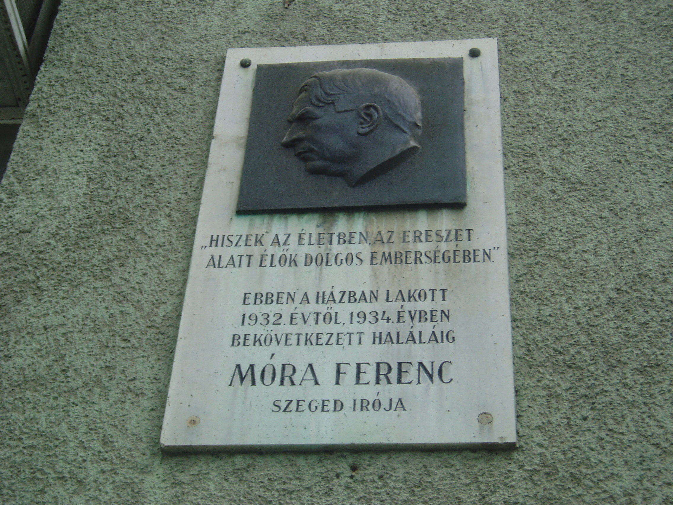 Nyilvános 1109 | 1624 | Szeged, Boldogasszony sugárút 15. | Az alaposan átalakított városi házban volt Móra Ferenc utolsó lakása. 1932-ben költözött ide a Kölcsey utca 10. szám alatti lakásából. Új otthonát csak rövid ideig élvezhette, rátört a súlyos betegség, a hasnyáálmirigyrák. Halála előtt két hónappal itt kereste fel őt az erdélyi írók küldöttsége: Tamási Áron, Bánffy Miklós, Kemény János, Kós Károly és Ligeti Ernő. 1934. január 20-án a szegedi ipartestület küldöttségét fogadta lakásában. A foltozó szűcs fia ekkor vallotta magát "nemzeti szolgálómesternek". 1934. február 8-án hunyt el, sírja a Belvárosi temetőben (lásd: Szeged, Fonógyári út) van. Az épületen lévő emléktábláját Tápay Antal készítette. A fénykép 2007 júliusában készült. Felh. irod.: Péter László: Szeged. Bp. Panoráma, 1981 |