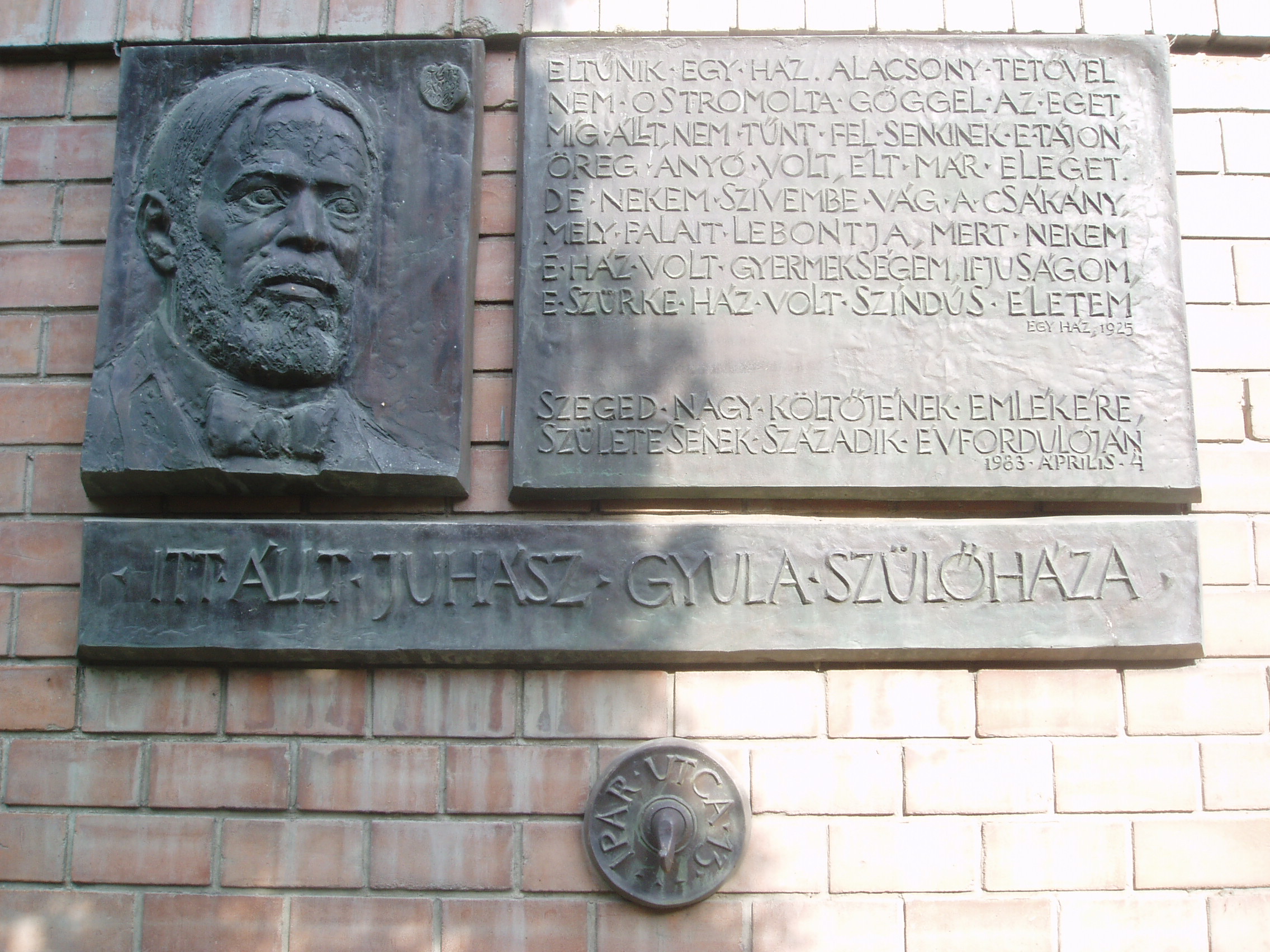 Nyilvános 1084 | 1634 | Szeged, Pécsi utca 4. | A klinikák kertjének épületeit 1926 és 1930 között emelték Korb Flóris tervei szerint. Az egyforma klinikák rendeltetésüknek megfelelő, célszerű épületek, de sivárak és ridegek. A sebészeti klinika épületének falán portrédomborműves emléktála hirdeti, hogy az egykor itt állott Ipar utca 13. számú, alacsony tetejű, öreg házacskában született 1883. április 4-én Juhász Gyula. Szülőháza a klinika hátsó bejárata táján állott, a Tisza vonalára merőlegesen. Mint a költő Április bolondja című versében írta: A Tisza partján ringatott a bölcsőm, Holdtölte volt - tavaszi anda hold - S a szőke fényben az éjet betöltőn A Vizek népe mind nászdalt dalolt. Irodalomtörténeti érdekesség, hogy 1866-ban ugyanebben a házban, sőt, abban a szobában, amelyben Juhász Gyula született, lakott fél évig szegedi diák korában Petőfi Zoltán. Juhász Gyula így írt erről: "A königgrätzi csata után Petőfi István csákói gazdatiszt érdekes kosztost hozott nagyapámnak a szegedi Serház utcai házába: Zoltánkát, a magyar sasfiókot. Abban a szobában lakott fél évig a nagy Petőfi kis fia, amelyben én születtem. Így esett egy halvány fénysugár az örök glóriából az én szegény fejemre..." Szülőházának lebontásakor, 1926-ban a költő verssel búcsúzott egykori otthonától, melynek sorai az 1983-ban felállított emléktáblán olvashatók. A fénykép 2007 júliusában készült. Felh. irod.: Péter László: Szeged. Bp. Panoráma, 1981 |