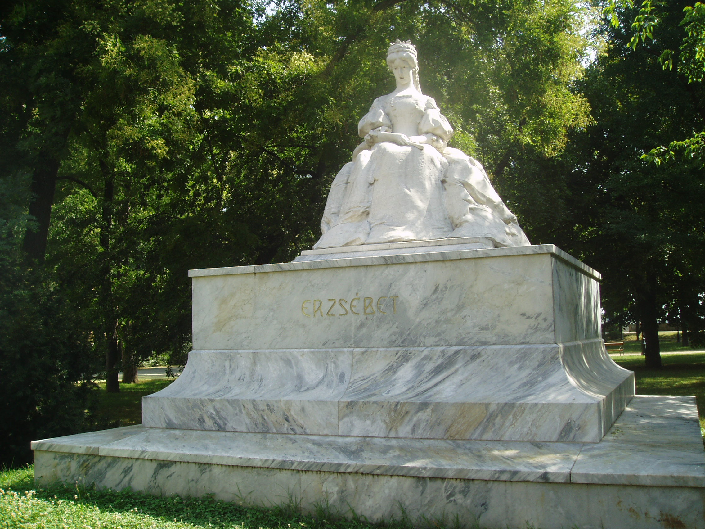 Nyilvános 1109 | 1751 | Szeged, Stefánia: Erzsébet királyné szobra | A Tisza vonalával párhuzamos Stefánia sétányon, a Nemzeti Színházzal szemben, harmonikus természeti környezetben látható Erzsébet királyné szobra. Ligeti Miklós carrarai márványból készült alkotását 1907-ben eredetileg a vármúzeum kertjében állították fel. A közelmúltban került ide, méltó helyére. A fénykép 2007 júliusában készült. Felh. irod.: Péter László: Szeged. Bp. Panoráma, 1981 |
