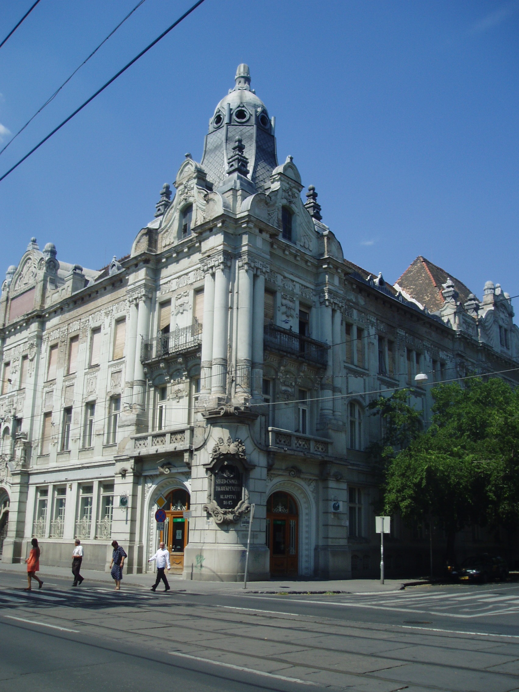 Nyilvános 1099 | 1548 | Szeged, Széchenyi tér 7. | A Széchenyi tér Magyarország egyik legszebb, legnagyobb szabályos négyszög alakú tere. 1848-ban Szabadság térnek nevezték el. 1860-ban, halála után kapta a "legnagyobb magyar" nevét. A 7. számot viselő palota 1904-ben Baumhorn Lipót tervei szerint épült 1904-ben szecessziós stílusban az egykori Szeged-Csongrádi Takarékpénztár székházának. A fénykép 2007 júliusában készült. Felh. irod.: Péter László: Szeged. Bp. Panoráma, 1981 |