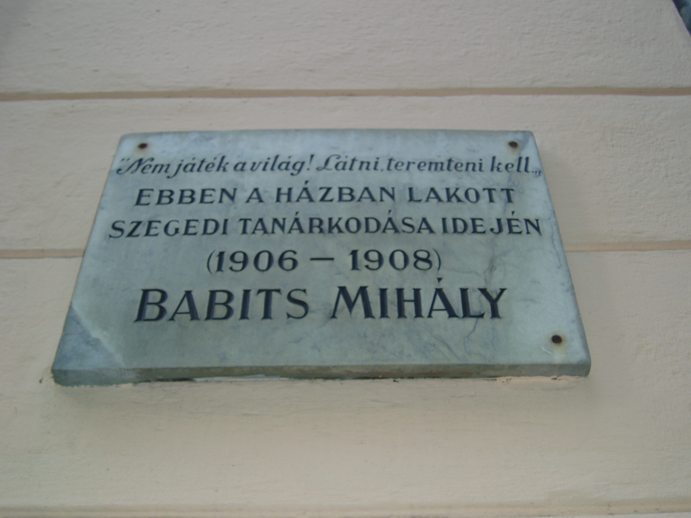 Nyilvános 1224 | 1829 | Szeged, Vitéz utca 16. | A Szentháromság utcát keresztező Vitéz utca 16. számú házán emléktábla olvasható: e házban lakott szegedi tanárkodása idején (lásd: Szeged, Horváth Mihály u. 2.), 1906 karácsonyától 1908 nyaráig Babits Mihály. 1956-ban, a tábla leleplezésekor jelen volt Szabó Lőrinc. Az emlékünnepségen ő idézte fel mesterének és barátjának alakját. Babits alkotói csöndet talált ebben a házban. A költőtárs Juhász Gyula, aki többször járt itt nála, 1924-ben megjelent "Babits Szegeden" című írásában így emlékezett: "Életét megosztotta az iskola és az irodalom között; volt idő, amikor csak az éjszaka óráit szakíthatta a költészetnek ... Megesett, hogy késő reggel benyitottam hozzá, és még mindig olvasmányába elmerülten találtam. Lámpája égett, pedig a nap már régen besütött az ablakán." Itt írta Babits a "Levelek Írisz koszorújából" című kötetének számos versét és itt érlelődött benne Dante-fordítása is. A fénykép 2007 júliusában készült. Felh. irod.: Péter László: Szeged. Bp. Panoráma, 1981 |