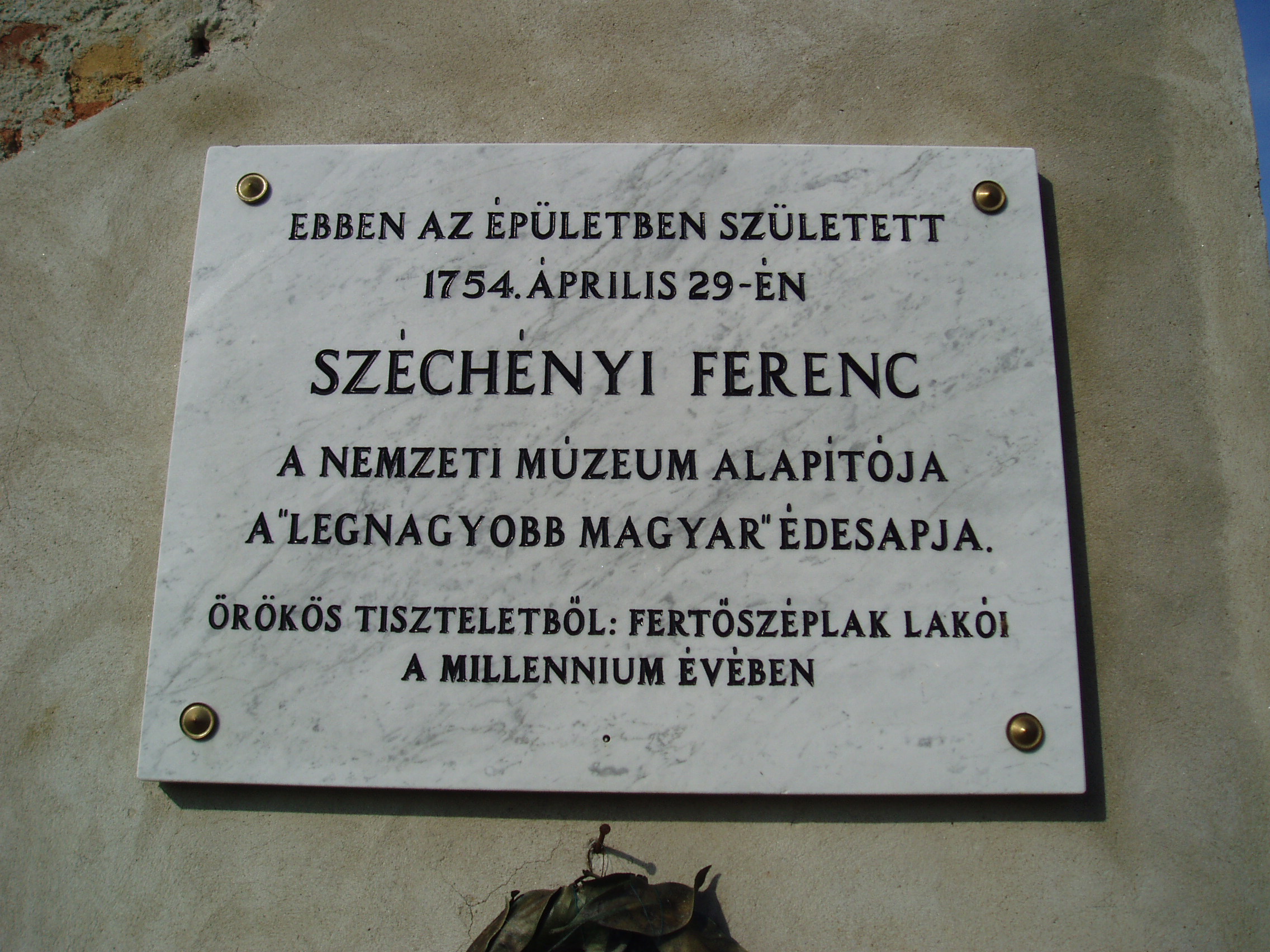 Nyilvános 1271 | 1987 | Fertőszéplak, Hősök tere 1. | Az egykori Széchényi-kastély ma elhanyagolt állapotú. Kapuja félköríves, oldalt toszkán félpillérekkel. Az udvari belső falon olvasható a Széchényiek jeligéje: "Deus me regit, nihil me deerit" (Isten velem van, baj nem érhet). A kastélyban született Széchényi Ferenc, a Nemzeti Múzeum és Könyvtár alapítója, Széchenyi István édesapja. Felh. irod.: www.vendegvaro.hu Látnivalók Győr-Moson-Sopron megyében. Miskolc, Well-PRess, 2000 |