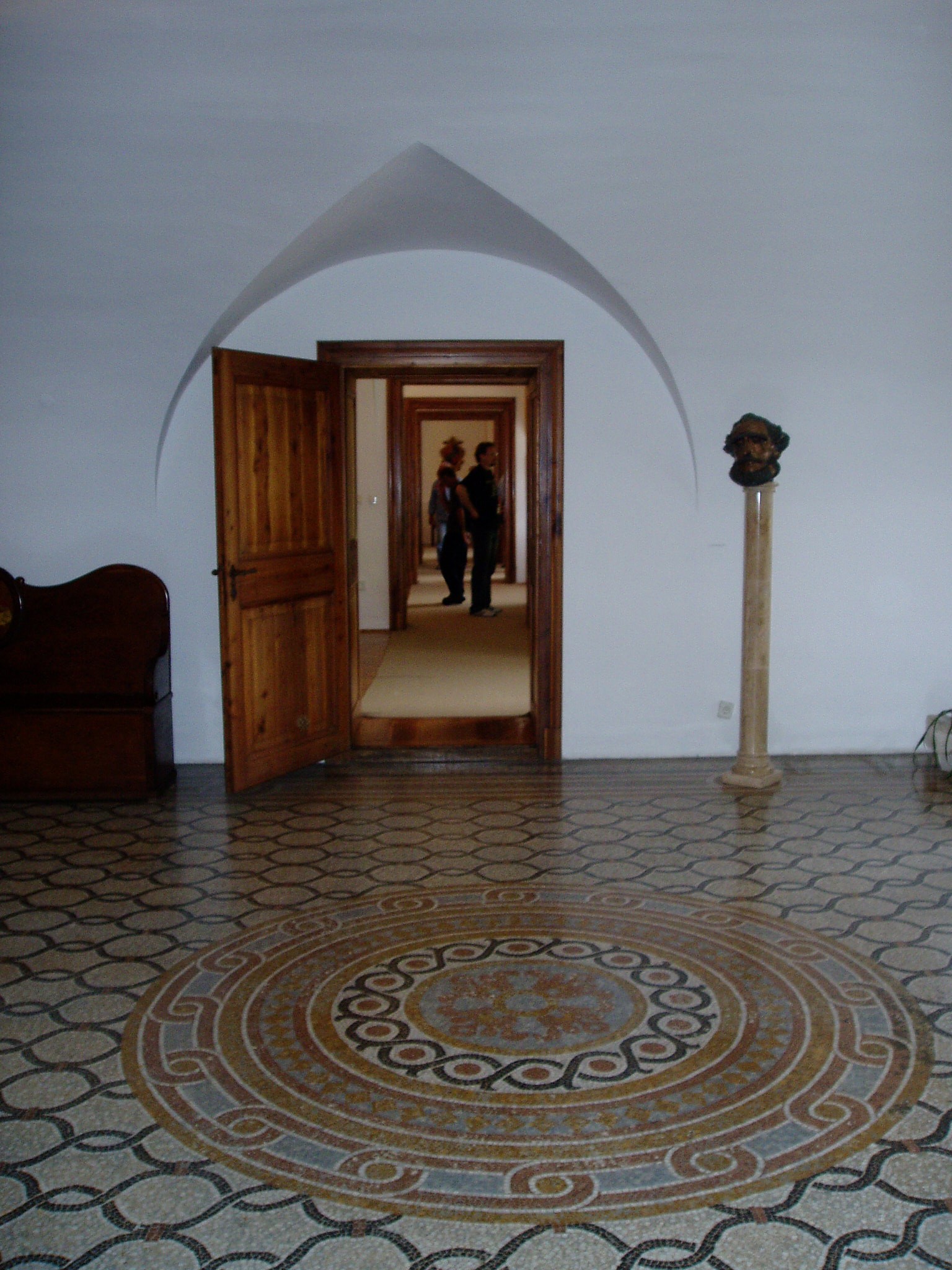 Nyilvános 1244 | 2256 | Nagycenk, Széchenyi-kastély | A barokk kastély építészeti szempontból is érdekes. Kiemelt jelentőségét azonban az adja, hogy itt élt a "legnagyobb magyarként" tisztelt Széchenyi István. A kastély ma emlékmúzeum. Az előcsarnok márvány mozaikpadlója a kastély eredeti értékei közé tartozik. A fénykép 2005 júliusában készült. Felh. irod.: Látnivalók Győr-Moson-Sopron megyében. Miskolc, Well-PRess, 2000 |
