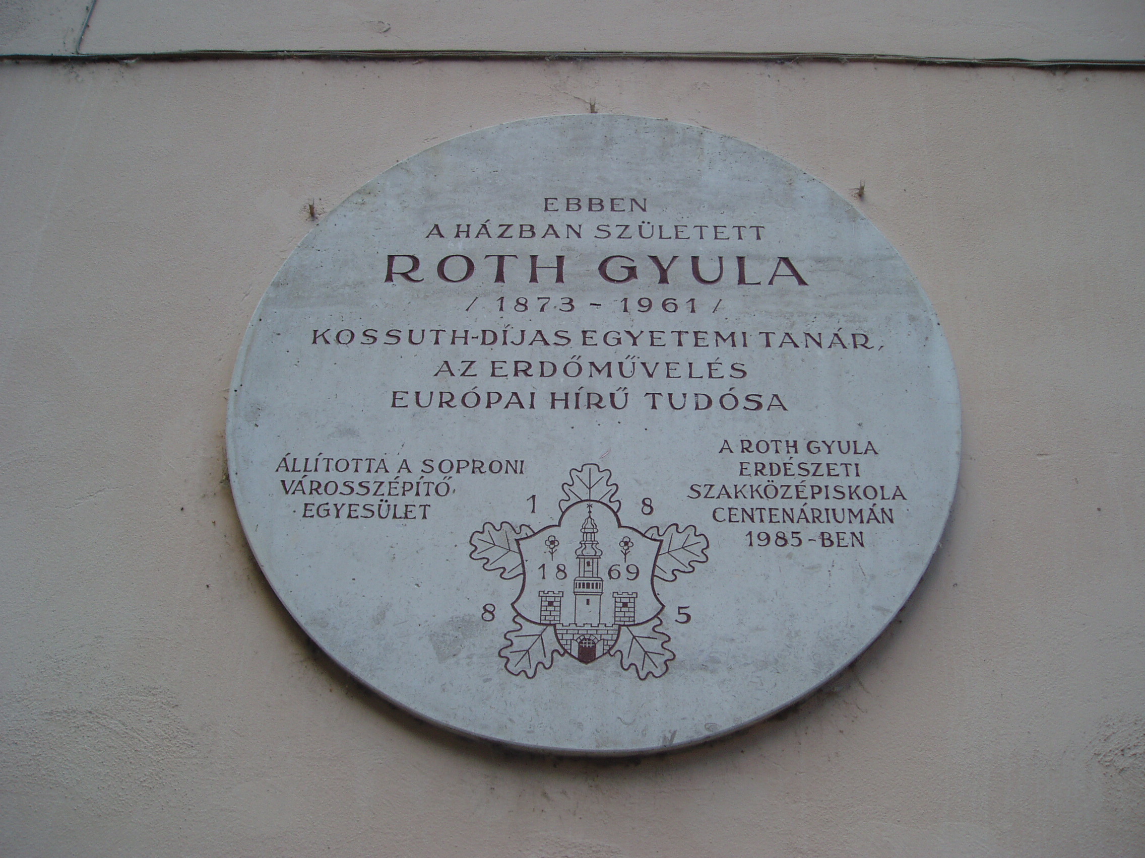 Nyilvános 1112 | 1599 | Sopron, Előkapu 3. | Sopron belvárosának főbejárata az északon nyíló Előkapu. Helye már a római korban lakott volt, majd a középkorban erődítésrendszert alakítottak itt ki. A területet a XVIII. század közepétől kezdték beépíteni lakóházakkal. A homlokzaton elhelyezett emléktábla tanúsága szerint a 3. szám alatt született Roth Gyula (1873-1961) Kossuth-díjas egyetemi tanár, az erdőművelés európai hírű tudósa. A fénykép 2008 júniusában készült. Felh. irod.: Czellár Katalin: Sopron. 3. jav. kiad. Bp. Panoráma, 2000 |