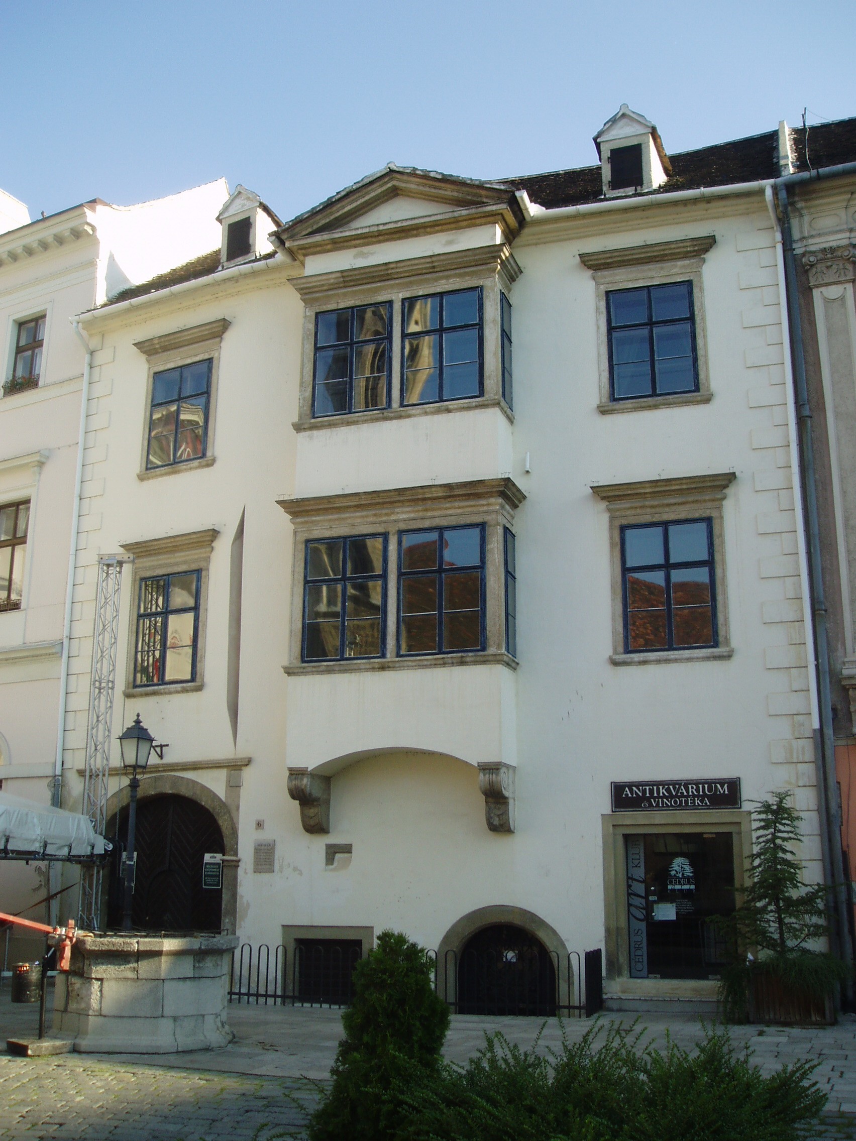 Nyilvános 1086 | 1605 | Fő tér 6. Fabricius-ház | A középkorban a telken két ház állt, amelyeket római kori középület maradványain emeltek. Folyamatos bővítések után a gótikus épületeket a XVIII. században kapcsolták össze, ekkor nyerte el a ház mai alakját. Ebből az időből származik az udvar kétemeletes loggiája és az utcai szárny emeletén a faragott famennyezet. Fő téri homlokzata a XIX. század elejéről származik. A ház hátsó fala a középkori városfalra épült, sőt, valószínűleg azonos is a városfallal. Az épületet 1806-ban vette meg a Felvidékről származó Fabricius András. Soproni katonáskodása idején gyakori látogatója volt a háznak Petőfi Sándor. A Fabricius család később az evangélikus egyháznak adományozta. A kép 2008 júniusában készült. Felh.irod.: Czellár Katalin: Sopron. 3. jav. kiad. Bp. Panoráma, 2000 |