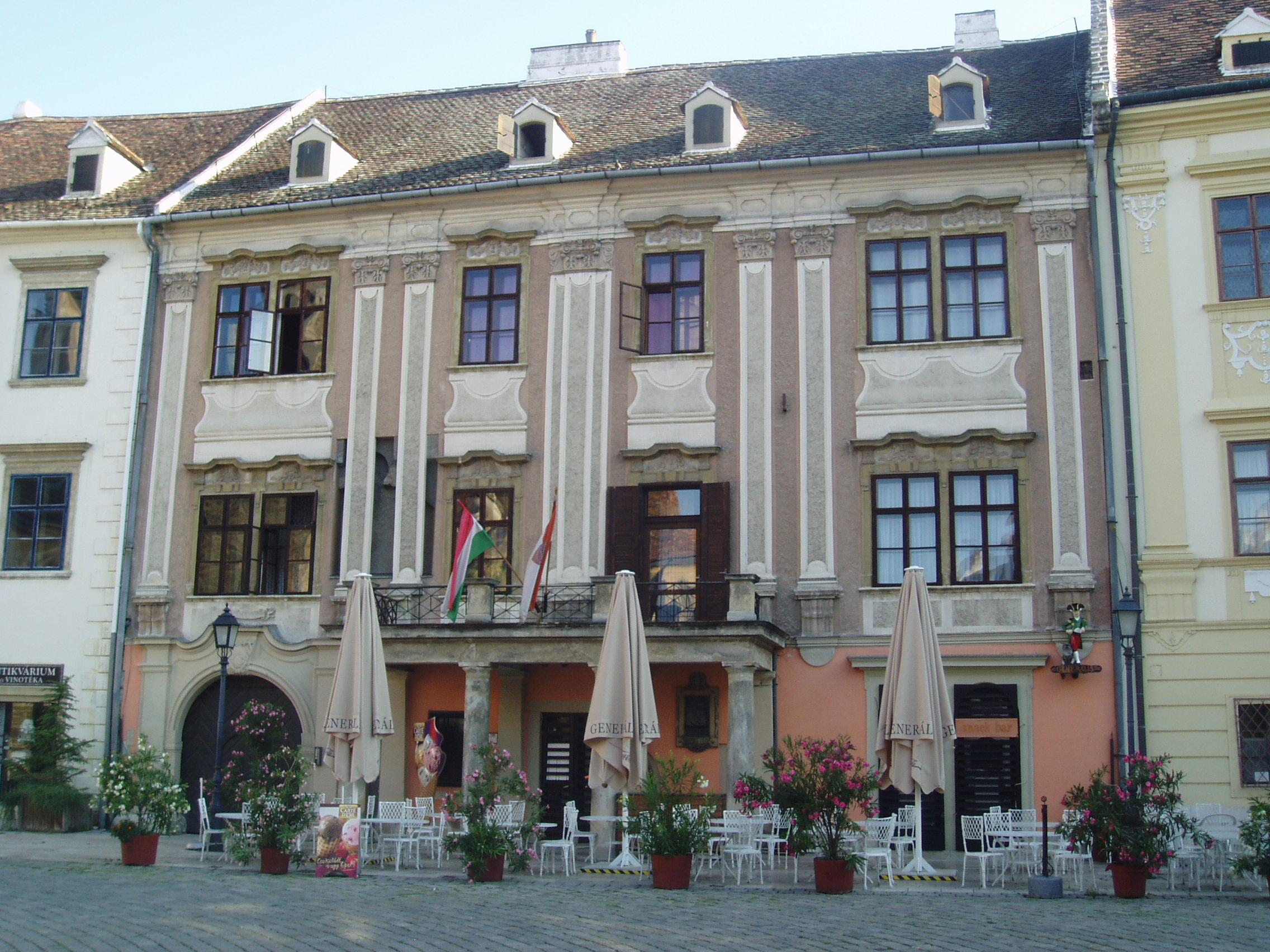 Nyilvános 1100 | 1479 | Fő tér 7. Lackner-ház vagy Tábornok-ház | Udvari, keleti szárnya és a toronyhoz csatlakozó háromszintes rész a XV. században épült. A XVII. század elején a legendás polgármester, Lackner Kristóf tulajdona volt. Ebből az időből származhat főhomlokzata. 1631-ben bekövetkezett halálával Lackner kívánságára a városra szállt, azóta is többször átépítették, illetve tűzvész okozta károk után helyreállították. A főhomlokzat előtti klasszicista erkély 180-ból származik. Ide szállásolták el egykor Sopron katonai parancsnokait, másik nevét erről kapta. A kép 2008 júniusában készült. Felh.irod.: Czellár Katalin: Sopron. 3. jav. kiad. Bp. Panoráma, 2000 |