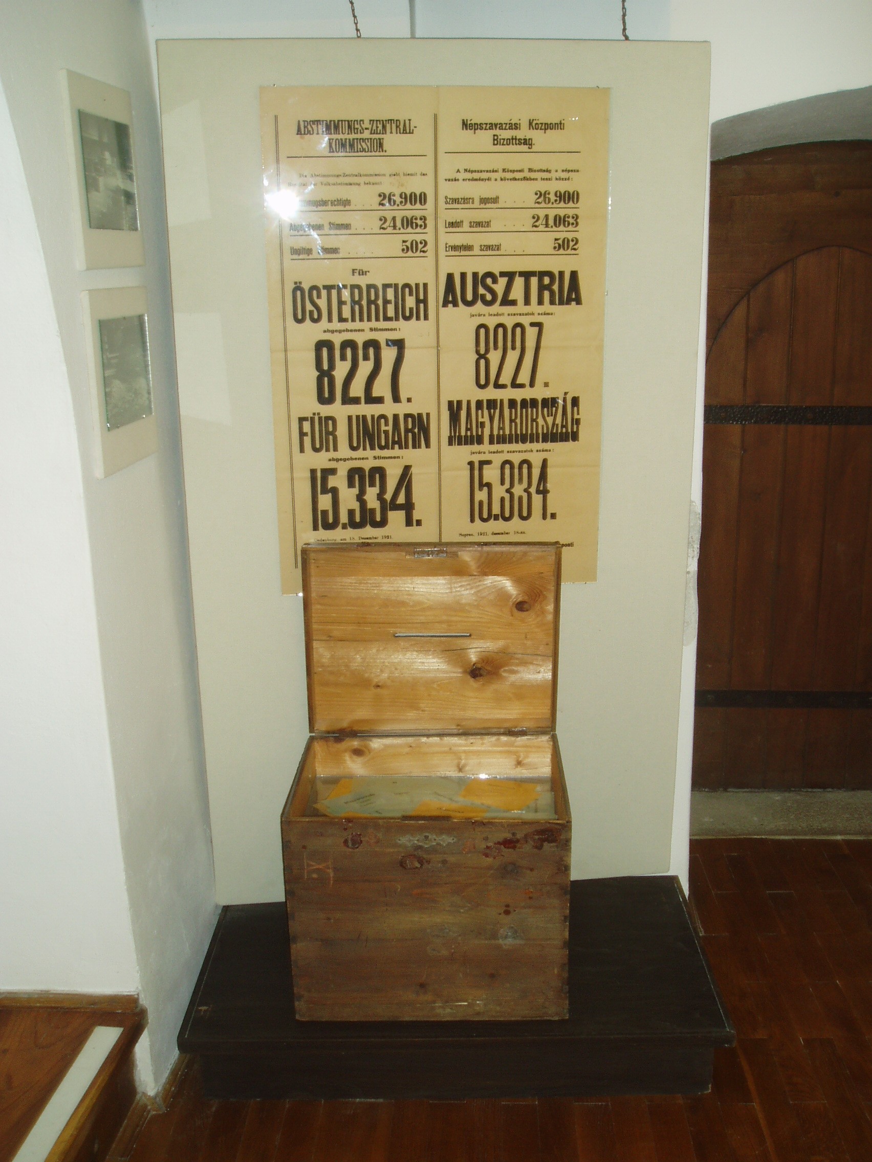 Nyilvános 1021 | 1311 | Fő tér 8. Storno-ház | Sopron városközpontjának egyik szép műemléke a középkori eredetű kétemeletes Storno–ház, amely mai formáját 1720 körül kapta. A történelmi múltú házban 1482-1483 telén hosszabb ideig tartózkodott Mátyás király, innét intézte bécsi hadjáratának ügyeit. Az eseményt a homlokzaton emléktábla örökíti meg. Az épület 1698-tól 1872-ig a Festetich család tulajdona volt. 1872-ben id. Storno Ferenc festőművész, restaurátor vette meg családi otthonnak, s itt helyezte el műgyűjteményét. A Storno–ház ma múzeum. Első emeletén a Soproni Múzeum várostörténeti kiállítása kapott helyet. A második emeleten a ház egykori lakói, id. és ifj. Storno Ferenc által gazdagon dekorált és berendezett helyiségek tekinthetők meg. A képen a Sopron sorsát eldöntő népszavazás eredményét közzétevő korabeli plakát látható. A kép 2008 júniusában készült. Felh.irod.: Czellár Katalin: Sopron. 3. jav. kiad. Bp. Panoráma, 2000 Askercz Éva: Storno–gyűjtemény. Bp. TKM 1987 /Tájak–Korok–Múzeumok Kiskönyvtára 276./ |