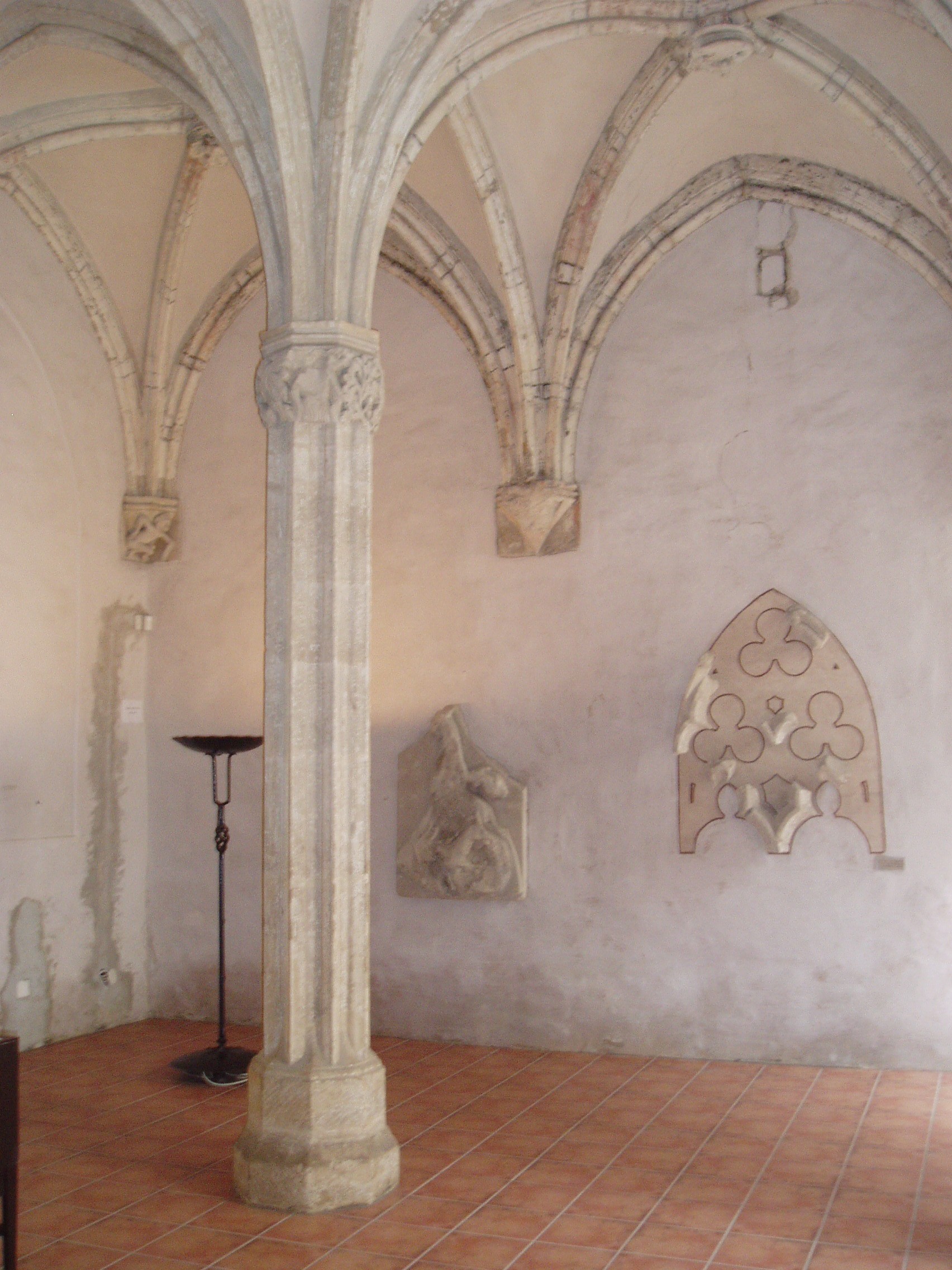 Nyilvános 897 | 1668 | Sopron, Fő tér: Kecske-templom - Káptalanterem | A Kecske–templomhoz a Templom utca felől kapcsolódik az egykori bencés rendház két udvart körülfogó, kétemeletes, nagy tömegű, de igénytelen külsejű épülete. A templommal együtt a ferencesek számára épült a XIV. században, majd 1802-ben a bencések kapták meg. E hajdani kolostor tartozéka a látogatók számára a templomból megközelíthető Káptalan–terem, Sopron város egyik legszebb gótikus műemléke. A háromhajós terem gótikus keresztboltozatait két karcsú nyolcszögletes pillér támasztja alá. A hajókhoz kelet felől egy–egy kápolnaszerű bővület csatlakozik, amelyeket pilléreken nyugvó csúcsíves árkád választ el a teremtől. A fénykép 2008 júniusában készült. Felh. irod.: Czellár Katalin: Sopron. 3. jav. kiad. Bp. Panoráma, 2000 |
