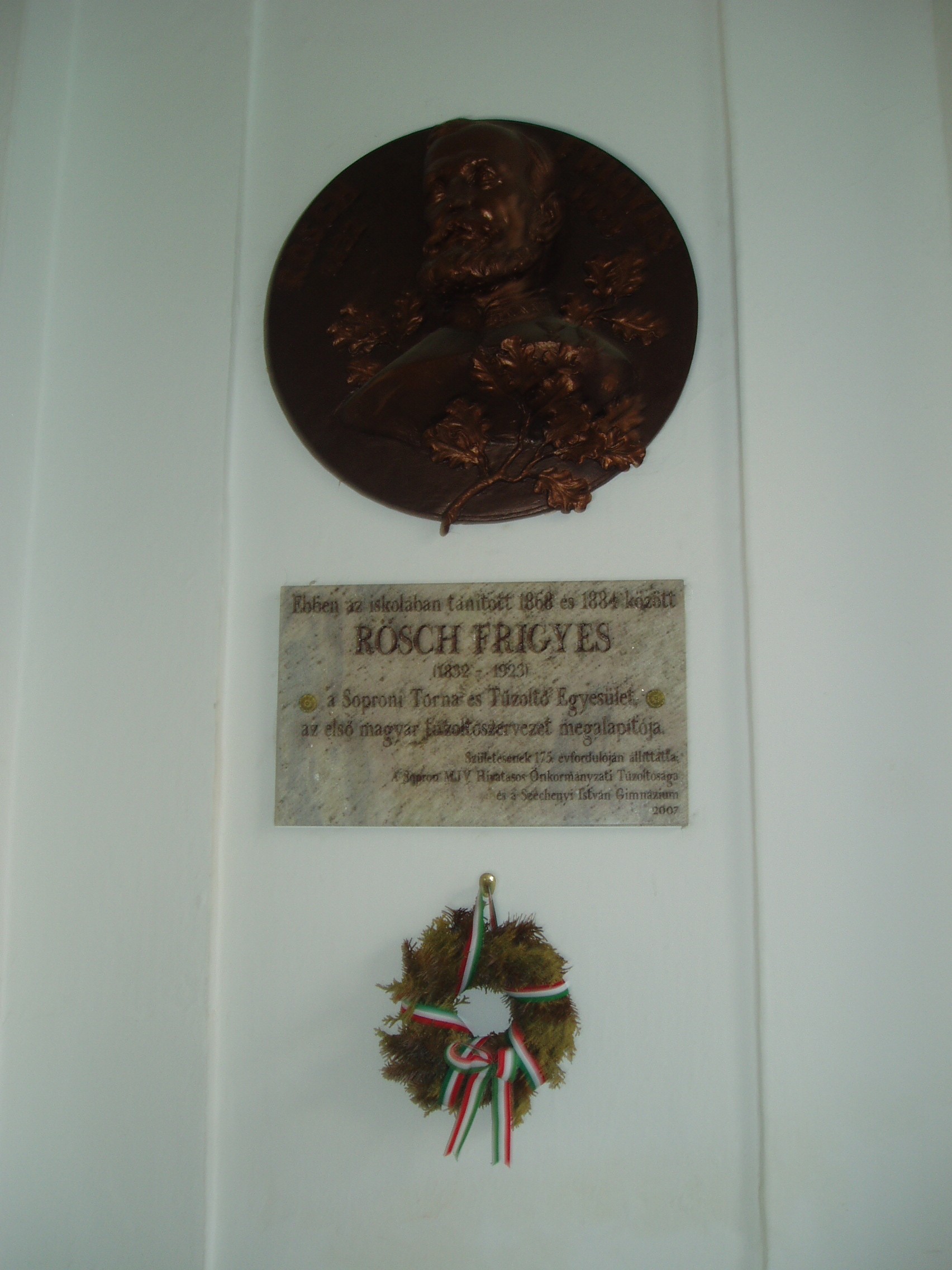 Nyilvános 1116 | 1607 | Sopron, Liszt Ferenc utca 1. | A Széchenyi István Gimnázium eredetileg reáliskola volt, amelyet 1850-ben alapítottak (lásd: Liszt Ferenc utca 2.). A Liszt Ferenc utca sarkán álló épületrészét, amelynek ezen a képen az udvari része látható, 1872-ben építették. A képen látható emléktáblát Rösch Frigyes (1832-1923) emlékére állították, aki 1868 és 1884 között itt tanított. Ő alapította meg a Soproni Torna és Tűzoltó Egyletet. A fénykép 2008 júniusában készült. Felh. irod.: http://szig.sopron.hu/ |