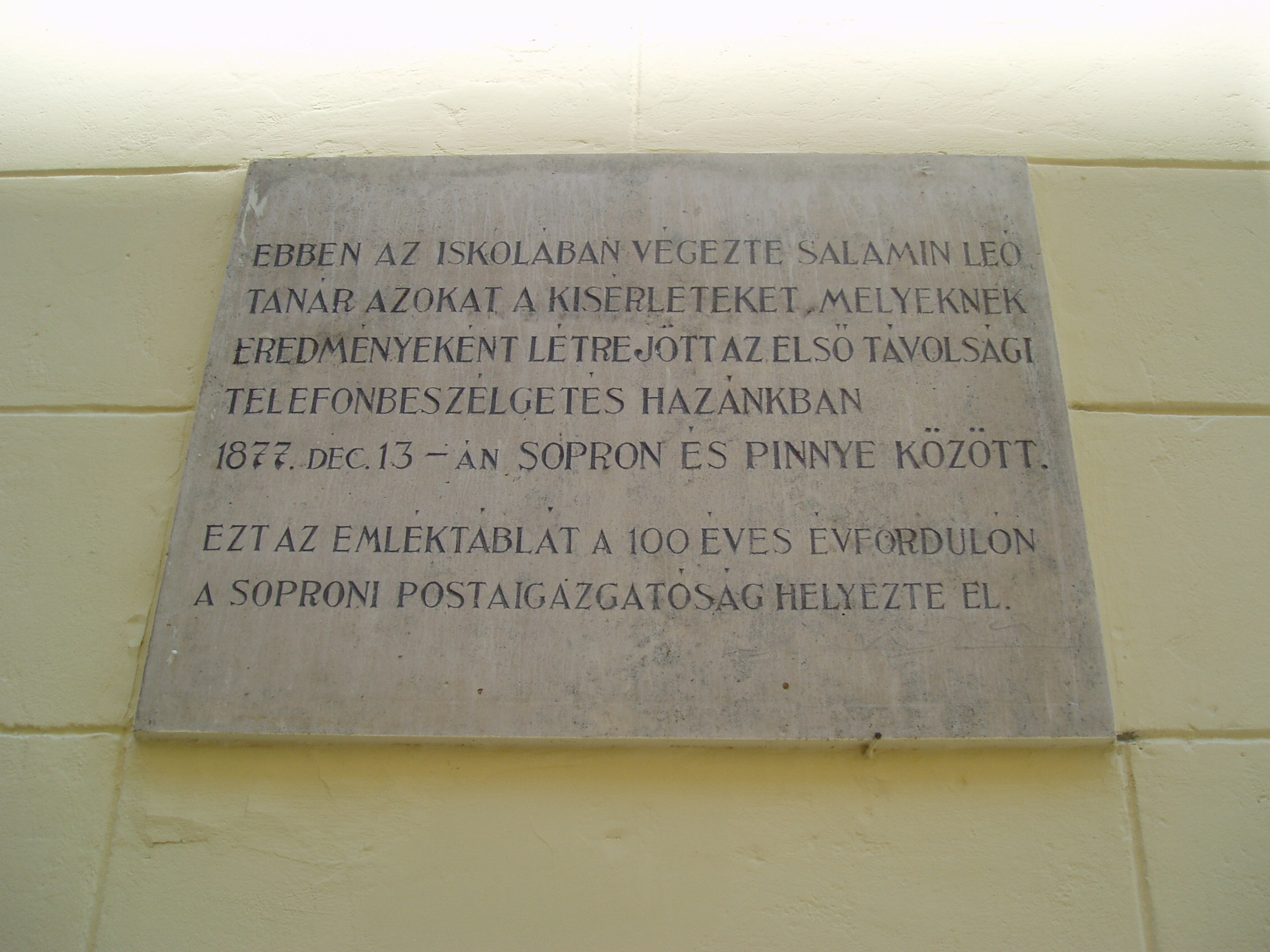 Nyilvános 1089 | 1448 | Sopron, Liszt Ferenc utca 2. | A Széchenyi István Gimnázium eredetileg reáliskola volt, amelyet 1850-ben alapítottak. Az épületen a soproni Postaigazgatóság által elhelyezett emléktábla megörökíti, hogy ebben az iskolában végezte Salamin Leó tanár azokat a kísérleteket, melyeknek eredményeként létrejött az első távolsági telefonbeszélgetés hazánkban 1877. december 13-án Sopron és Pinnye között. A kép 2008 júniusában készült. |