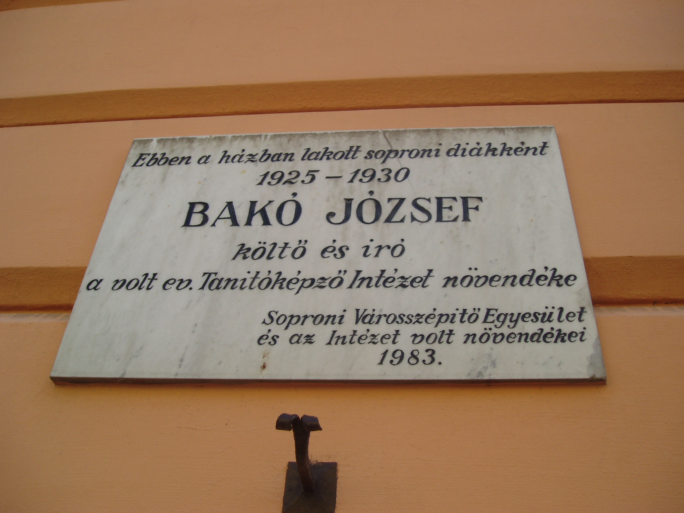 Nyilvános 1092 | 1693 | Sopron, Móricz Zsigmond utca 8. | Az emeletes épületen 1983-ban elhelyezett emléktábla tanúsága szerint soproni diákként ebben a házban lakott 1925 és 1930 között Bakó József költő és író, a volt evangélikus tanítóképző intézet növendéke. Bakó József (Nemescsó, 1896. aug. 24. - Bp., 1962. ápr. 7.): költő, elbeszélő. Zsellércsaládból származott, Másfél évtizedig cipész volt. A Tanácsköztársaság bukása után hét hónapi fogházbüntetést kapott. Utána sokat hányódott, amíg elvégezte a tanítóképzőt. Több helyen tanított, nyaranta bebarangolta egész Európát. A felszabadulás után dolgozott a vallás- és közoktatásügyi minisztériumban, a Köznevelés szerkesztőségében, valamint több könyvtárban, legutóbb az Országgyűlési Könyvtárban. Írásai már az 1920-as évek elejétől megjelentek a Népszavában, a Nyugatban, a Pesti Naplóban. Verseiben a paraszti élet nyomorát szólaltatta meg erőteljes realizmussal, hangja később forradalmibb, a felszabadulás után a megváltozott életről rajzolt képet. Prózai műveiben is a falusi élettel foglalkozott. A fénykép 2008 júniusában készült. Felh. irod.: http://www.netlexikon.hu/yrk/Ryrgenwm/613 |