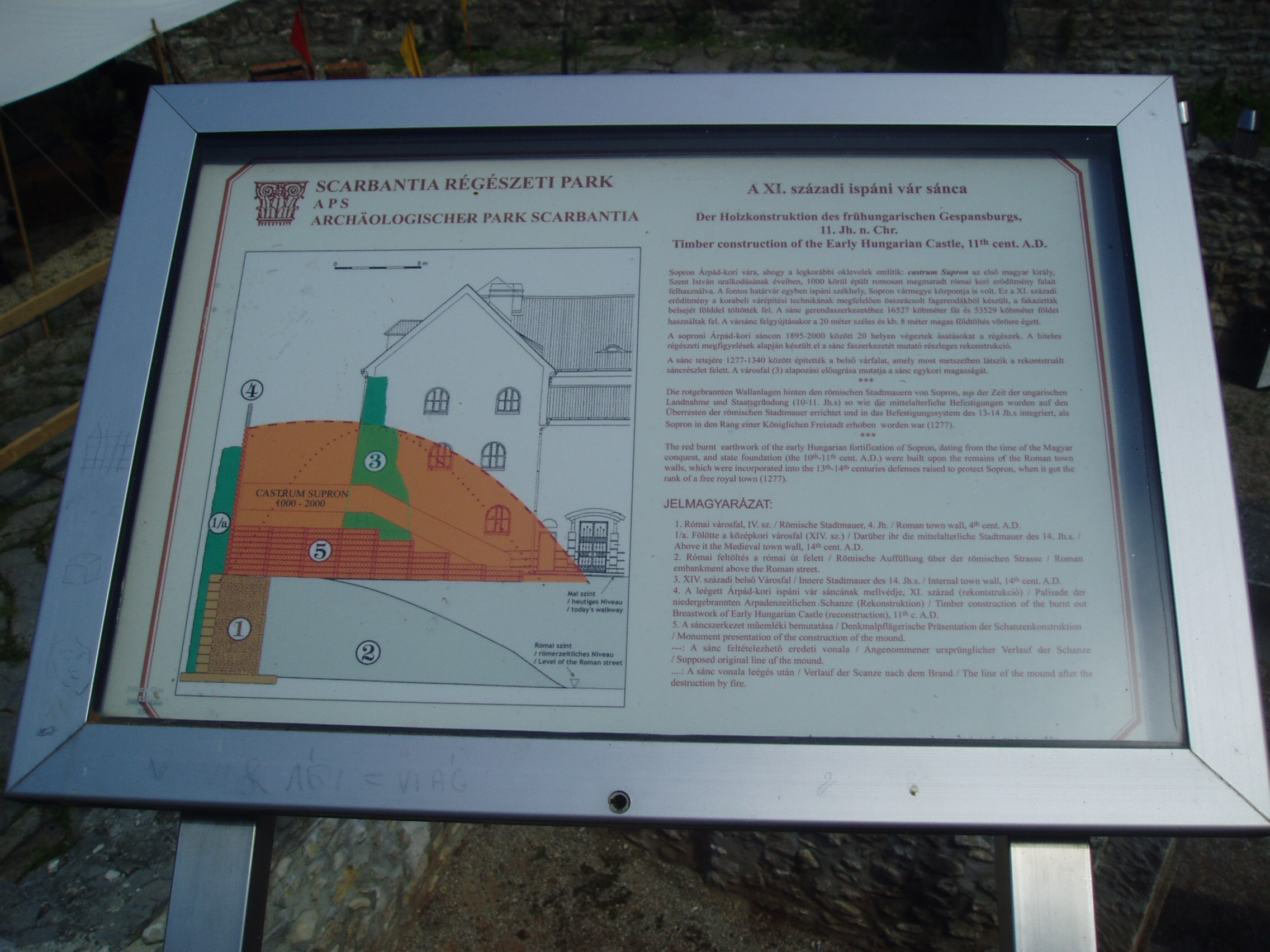 Nyilvános 1061 | 1363 | Sopron, Scarbantia Régészeti Park | Az egykori Római Birodalom Pannónia provinciájának egyik határállomása Scarbantia, a mai Sopron volt. A római oppidum központjának, a fórumnak legfontosabb épületét - a capitoliumi templomot - 1893 telén a városháza építésekor találták meg. Az 1960- és 1970-es évek ásatásaival végül sikerült meghatározni a fórum teljes kiterjedését és elhelyezkedését. A mai belváros szívében feltárt maradványokat - kiegészítve a a XI. századi ispáni vár feltárt sáncával - nagyszabású szabadtéri régészeti kiállítás keretében, térképekkel, ismertetőszövegekkel kellően ellátva szemlélheti meg a városnéző. A kép 2008 júniusában készült. |