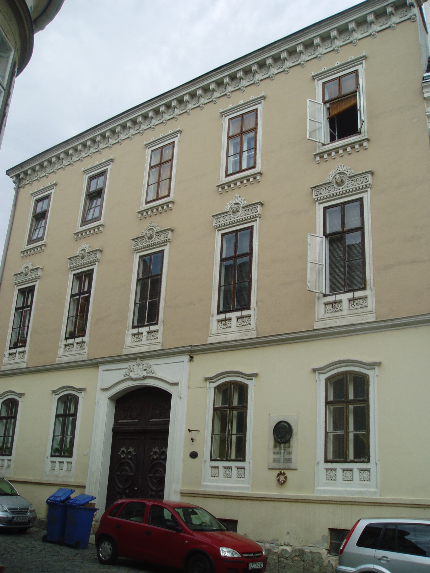 Nyilvános 1065 | 1489 | Sopron, Szent György utca 24. | Az 1860 körül emelt romantikus stílusú épületben lakott Frankenburg Adolf író, szerkesztő és Carina Anna operaénekesnő. Miután belső munkatársa volt Kossuth Pesti Hírlapjának, Frankenburg indította útjára a magyar irodalomtörténetben jelentős szerepet játszó Életképek című folyóiratot. Működése nem volt ínyére a kormányzatnak, ezért 1847-ben kancelláriai titkárnak Bécsbe helyezték. Mintegy két évtizedig élt ott. Sok zaklatásnak volt kitéve, ugyanis gyanúba fogták, hogy szerepet játszott a bécsi felkelés kirobbantásában. 1866-ban nyugdíjazását kérte s hazatért Magyarországra. Második felesége volt Carina Anna, aki 1863 és 1867 között állandó tagja volt a Nemzeti Színház operatársulatának. Ezután Bécsbe szerződött, s a pár a közeli Sopronban telepedett le. Csak hosszú együttélés után, 1881-ben tudtak házasságot kötni, amely rövid életű lett: Frankenburg 1884-ben, Carina Anna 1885-ben elhunyt. Sopronban Frankenburg megalapította az Irodalmi és Művészeti Kört, mely később felvette nevét. Az épületen csak Frankenburg nevét örökíti meg emléktábla, Neszthy Egonné Haich Erzsébet munkája (1934), s évszáma is hiányos. A kép 2008 júniusában készült. Felh. irod.: Berecz Dezső: Frankenburg Adolf harmadik felesége. = Soproni Szemle 1941 Berecz Dezső: Megemlékezés Frankenburg Adolf halálának századik évfordulóján. = Soproni Szemle 1984. 3. |