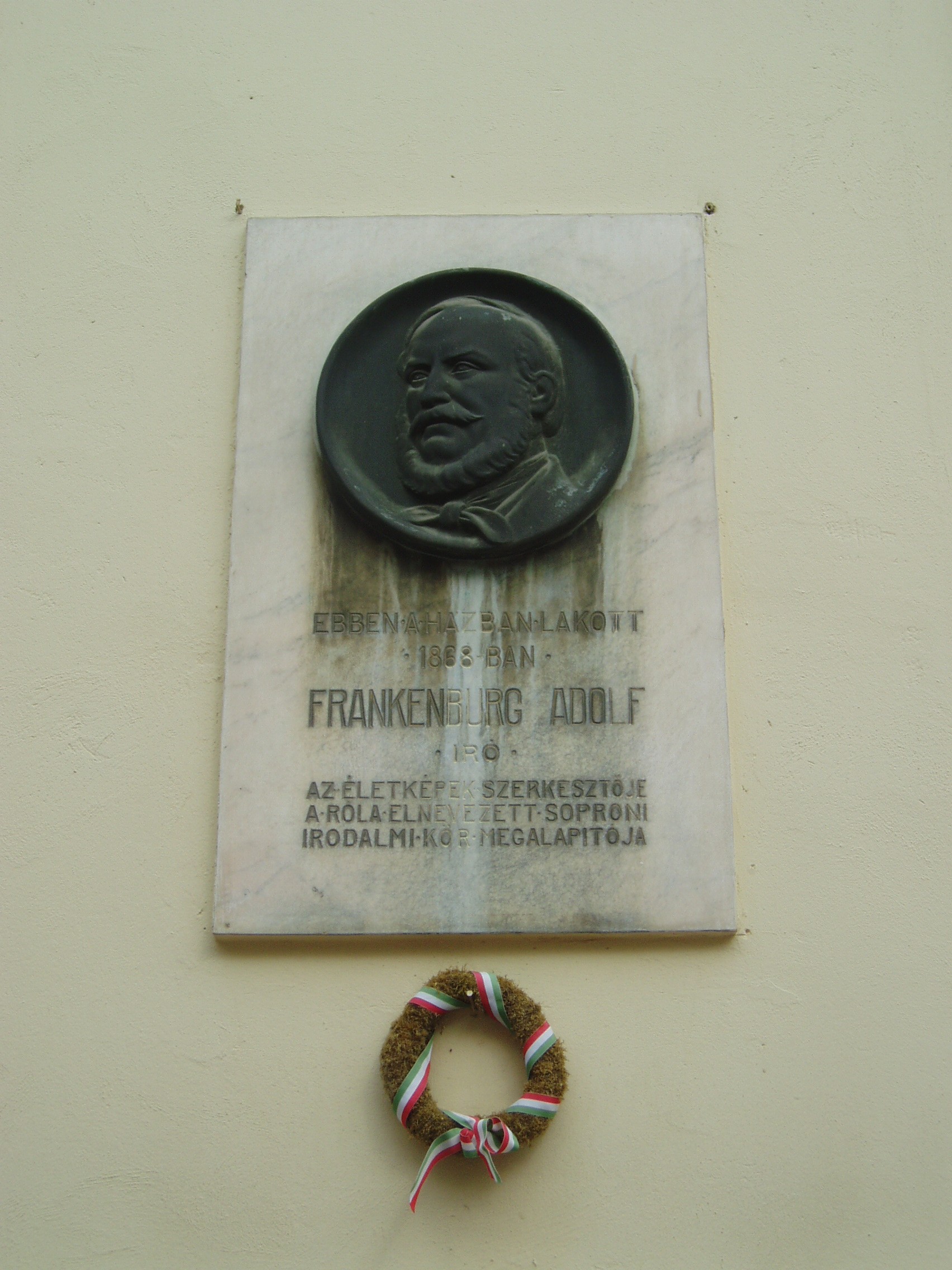 Nyilvános 1014 | 1422 | Sopron, Szent György utca 24. | Az 1860 körül emelt romantikus stílusú épületben lakott Frankenburg Adolf író, szerkesztő és Carina Anna operaénekesnő. Miután belső munkatársa volt Kossuth Pesti Hírlapjának, Frankenburg indította útjára a magyar irodalomtörténetben jelentős szerepet játszó Életképek című folyóiratot. Működése nem volt ínyére a kormányzatnak, ezért 1847-ben kancelláriai titkárnak Bécsbe helyezték. Mintegy két évtizedig élt ott. Sok zaklatásnak volt kitéve, ugyanis gyanúba fogták, hogy szerepet játszott a bécsi felkelés kirobbantásában. 1866-ban nyugdíjazását kérte s hazatért Magyarországra. Második felesége volt Carina Anna, aki 1863 és 1867 között állandó tagja volt a Nemzeti Színház operatársulatának. Ezután Bécsbe szerződött, s a pár a közeli Sopronban telepedett le. Csak hosszú együttélés után, 1881-ben tudtak házasságot kötni, amely rövid életű lett: Frankenburg 1884-ben, Carina Anna 1885-ben elhunyt. Sopronban Frankenburg megalapította az Irodalmi és Művészeti Kört, mely később felvette nevét. Az épületen csak Frankenburg nevét örökíti meg emléktábla, Neszthy Egonné Haich Erzsébet munkája (1934), s évszáma is hiányos. A kép 2008 júniusában készült. Felh. irod.: Berecz Dezső: Frankenburg Adolf harmadik felesége. = Soproni Szemle 1941 Berecz Dezső: Megemlékezés Frankenburg Adolf halálának századik évfordulóján. = Soproni Szemle 1984. 3. |