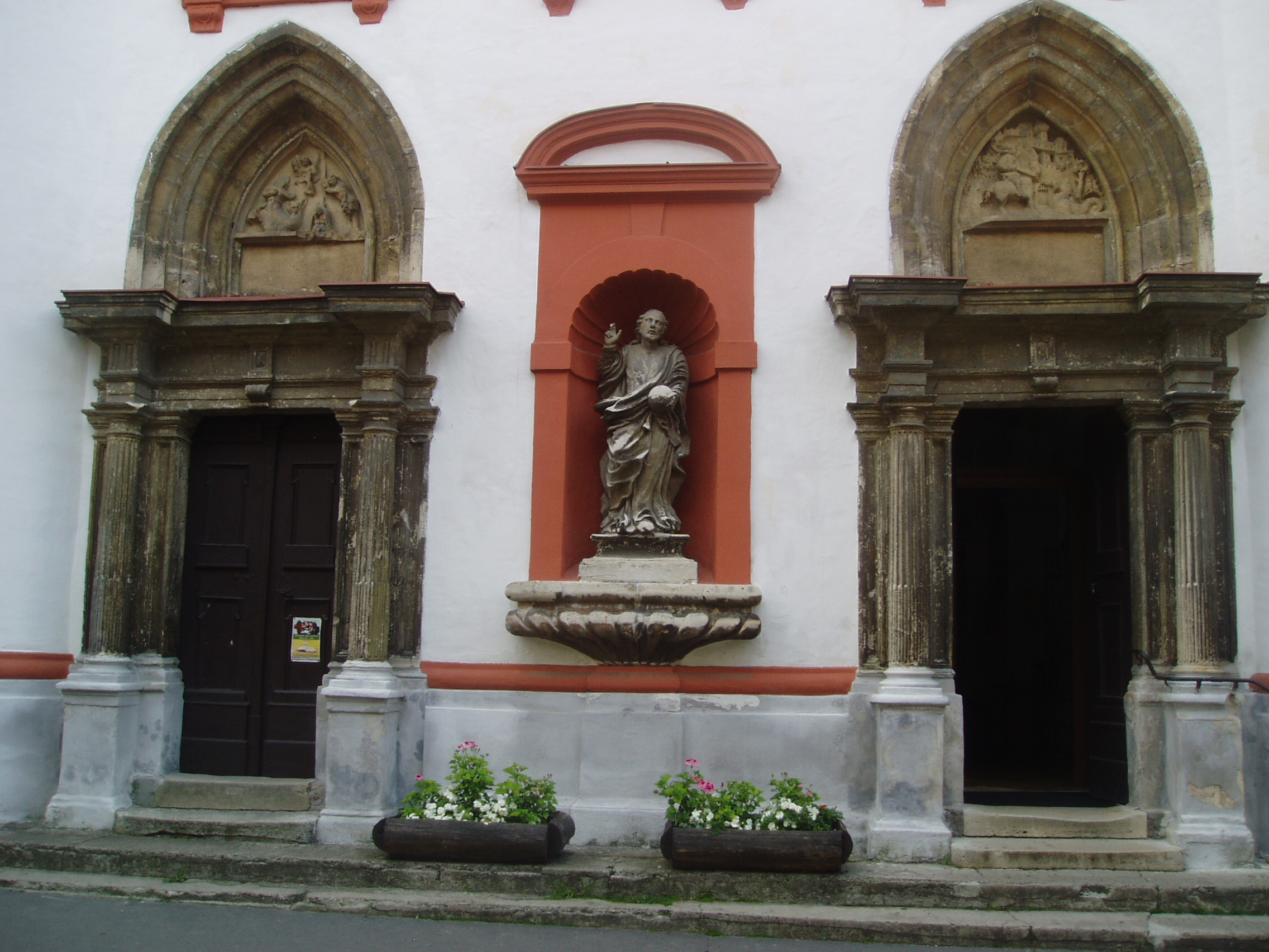 Nyilvános 1105 | 2436 | Sopron, Szent György utca 7. Szent György-templom | A Káptalan-házhoz azonos házszámmal csatlakozik a Szent György-templom. Az 1380–1430 között épült, eredetileg gótikus templom mozgalmas, olaszos homlokzata a XVII. századból származik, de rajta két gótikus dombormű máig megőrződött. Kisebb mértékben az 1760-as években is átalakították. Eklektikus tornya 1882-ben épült. Az egyhajós templomot az 1676-os tűzvész után több lépésben alakították át: a csúcsíves lezárású főhajót gazdag stukkóval díszítették, és két oldalán kápolnasorral keretezték. A szentély melletti keresztelőkápolnában középkori freskótöredéket látni. Az 1705–1706 között készült stukkódísz Pietro Antonio Conti műve, és berendezése is XVIII. századi. A kép 2008 júniusában készült. (A környék beépítettsége miatt csak ilyen felvételt tudtam róla készíteni: K.K.) Felh. irod.: Czellár Katalin: Sopron. 3. jav. kiad. Bp. Panoráma, 2000 |