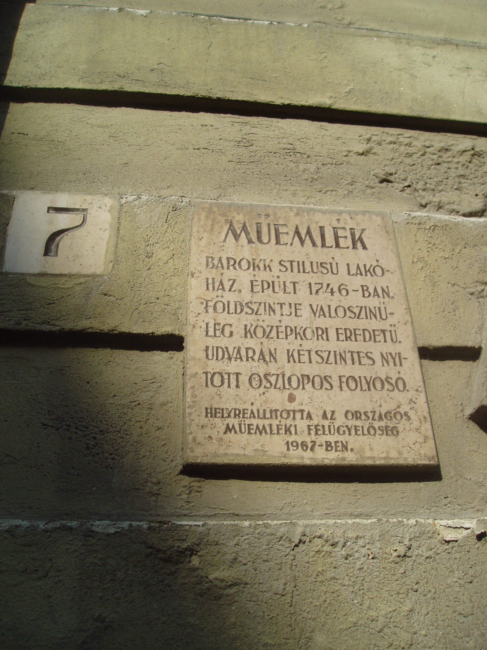 Nyilvános 1063 | 1432 | Sopron, Szentlélek utca 7. | A középkori eredetű barokk lakóház mai alakját 1746-ban nyerte. Restaurálásakor megtalálták a rizalitjának emeletén levő freskókat, amelyek ma a homlokzat legfőbb ékességei: középen sima kőkeretezésben a Szent Család látható, balra ovális keretben Mária a gyermek Jézussal, jobbra - hasonló keretben - Szent Flórián. A kép 2008 júniusában készült. Felh. irod.: Czellár Katalin: Sopron. 3. jav. kiad. Bp. Panoráma, 2000 |