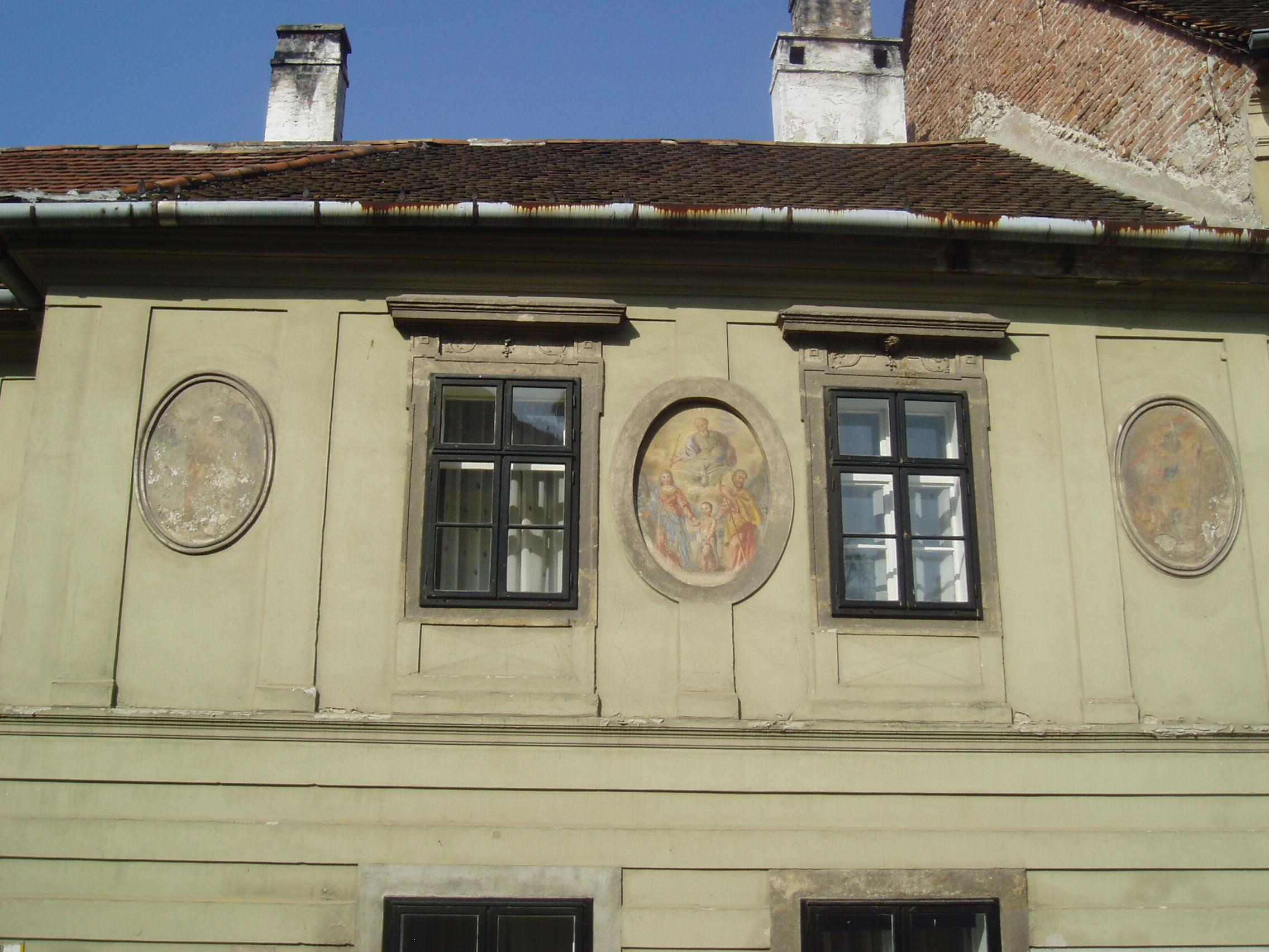 Nyilvános 1031 | 1443 | Sopron, Szentlélek utca 7. | A középkori eredetű barokk lakóház mai alakját 1746-ban nyerte. Restaurálásakor megtalálták a rizalitjának emeletén levő freskókat, amelyek ma a homlokzat legfőbb ékességei: középen sima kőkeretezésben a Szent Család látható, balra ovális keretben Mária a gyermek Jézussal, jobbra - hasonló keretben - Szent Flórián. A kép 2008 júniusában készült. Felh. irod.: Czellár Katalin: Sopron. 3. jav. kiad. Bp. Panoráma, 2000 |