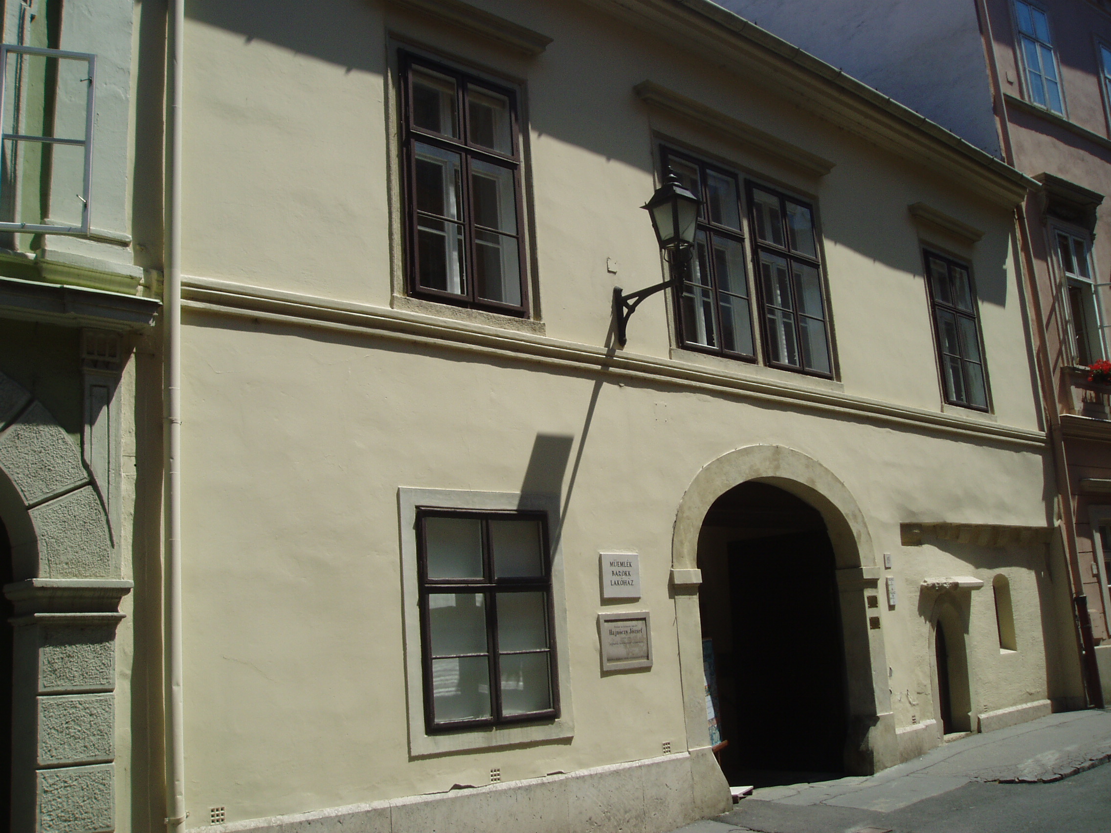 Nyilvános 1039 | 1300 | Sopron, Templom utca 19. | Középkori eredetű, egyszerű, egyemeletes lakóház. 1734-ben Hajnóczy Dániel, a neves tanár és hitszónok tulajdona volt. Az épületen emléktábla hirdeti, hogy ebben a házban lakott Hajnóczy József (1750-1795) jogtudós, felvilágosult gondolkodó, aki részt vett a Martinovics-féle összeesküvésben, amiért Budán lefejezték. A kép 2008 júniusában készült. Felh. irod.: Czellár Katalin: Sopron. 3. jav. kiad. Bp. Panoráma, 2000 |