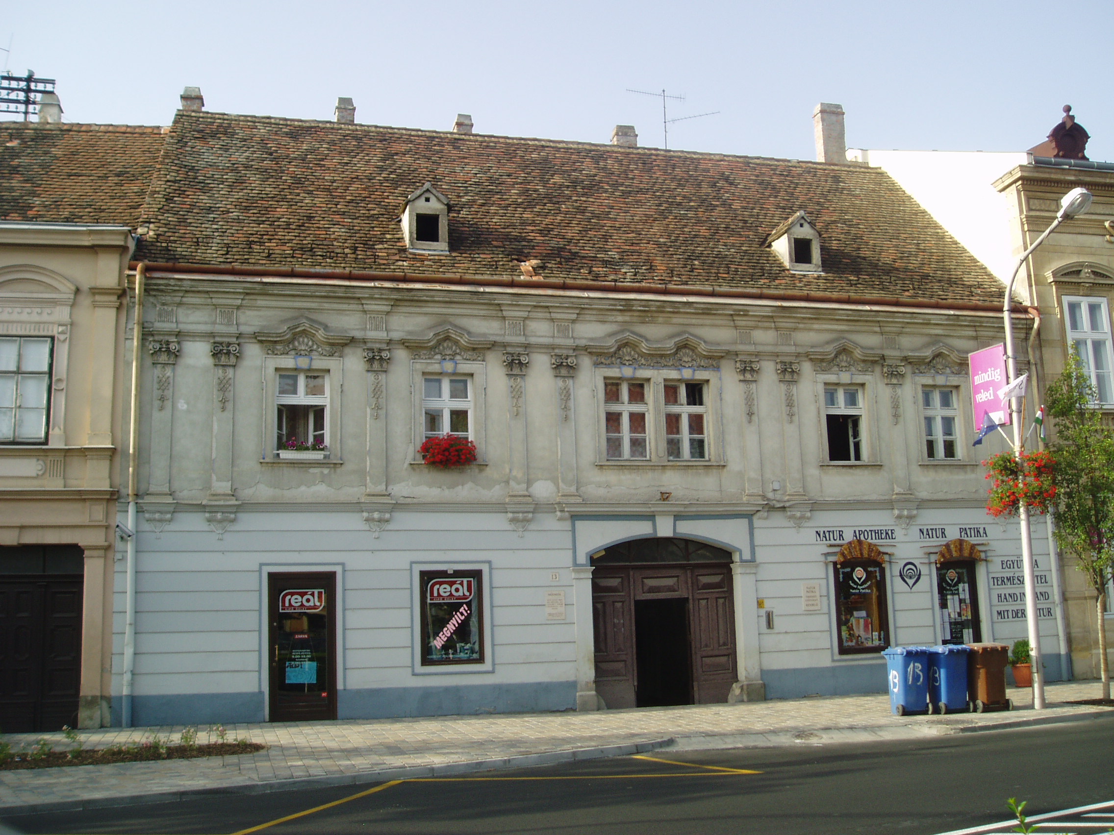 Nyilvános 1025 | 1416 | Sopron, Várkerület 13. Pócza-ház | Egy korábbi földszintes lakóház átépítésével mai alakját a XVIII. század közepén kapta. Egyik emeleti szobájának mennyezetét 1740-1750 körül készült stukkódísz ékesíti. A kép 2008 júniusában készült. Felh. irod.: Czellár Katalin: Sopron. 3. jav. kiad. Bp. Panoráma, 2000 |