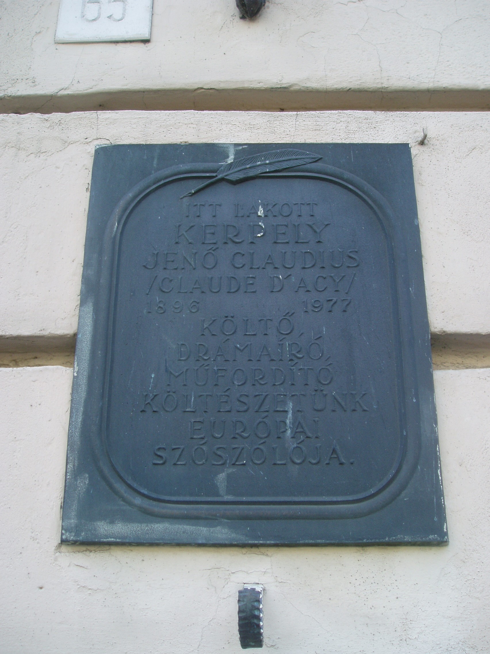 Nyilvános 1013 | 1395 | Sopron, Várkerület 65. | A kétemeletes városi palota homlokzatán olvasható emléktábla szerint itt lakott a soproni születésű Kerpely Jenő (1896-1977) költő, drámaíró, műfordító, újságíró. Budapesten, Bécsben és New Yorkban jogi tanulmányokat végzett. Ügyvédként és irodalmi jogképviseleti iroda vezetőjeként dolgozott Budapesten. Verseket, színműveket írt, német versfordításokat közölt osztrák, svájci és német lapokban. A Pester Lloydban külpolitikai cikkei jelentek meg. Thomas Mann ösztönzésére távozott a negyvenes évek végén Bécsbe. Ott folytatta műfordítói tevékenységét, számos magyar irodalmi művet fordított le németre, magyar költői antológiát adott ki. Német nyelvű műveit Eugen K. Claudius néven jelentette meg. A Claude d'Acy írói nevet is használta. Mindvégig az osztrák fővárosban élt, a végén eléggé visszavonultan. Magyar és német nyelven több könyve jelent meg a harmincas és negyvenes években. Felh. irod.: Borbándi Gyula: Nyugati magyar irodalmi lexikon és bibliográfia. Bp. Hitel, 1992 |