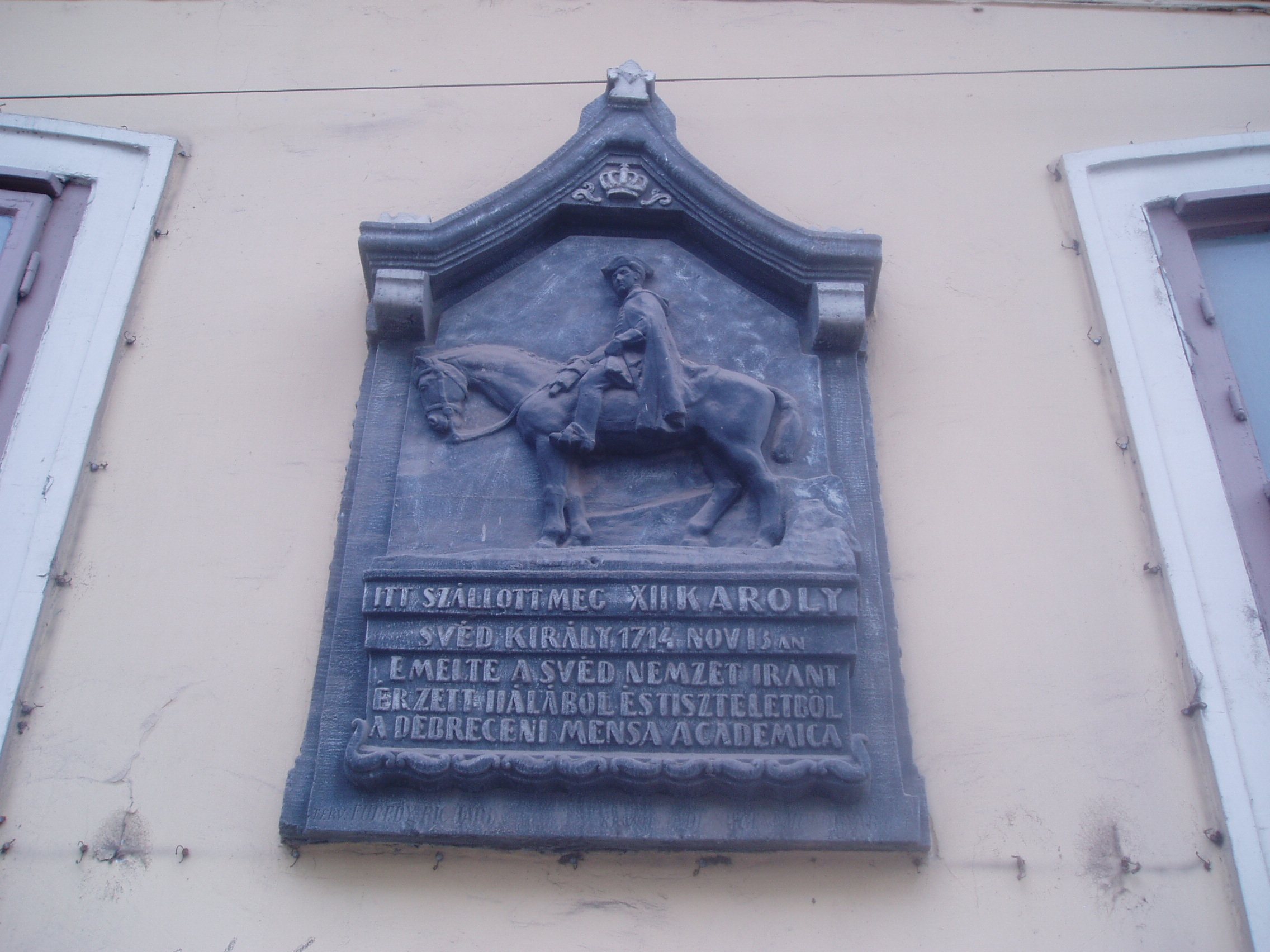 Nyilvános 1161 | 1610 | Debrecen, Széchenyi utca 6. | Debrecen legrégibb fennmaradt lakóháza az 1690-es években emelt patríciusház. A 17. század végén már Diószegi Sámuelé, a város főbírájáé, s első postamesteréé is volt. A ház így fogadóként is szolgált. Legnevezetesebb vendége XII. Károly svéd király volt, aki itt szállt meg 1714. november 16-án, amikor Törökországból hazafelé tartott az I. Péter orosz cártól elszenvedett vereség után. Az egykorú források megőrizték, hogy a király, aki nemcsak híres hadvezér és államférfi volt a maga korában, hanem felvilágosult gondolkodó is, igazi lelki gyönyörűséget talált a debreceni főbíró házánál, ahol a kollégium professzoraival, a nagy műveltségű, világot járt házigazdával és más olvasott férfiakkal találkozott. A továbbutazó király elégedetten jegyezte fel, hogy itt, a távoli magyar városban igen jól felszerelt és gazdag könyvtár állt rendelkezésére esti olvasás céljából. Felh. irod.: Papp Antal: Debrecen. Bp. Panoráma, 1976 www.debrecen.hu |