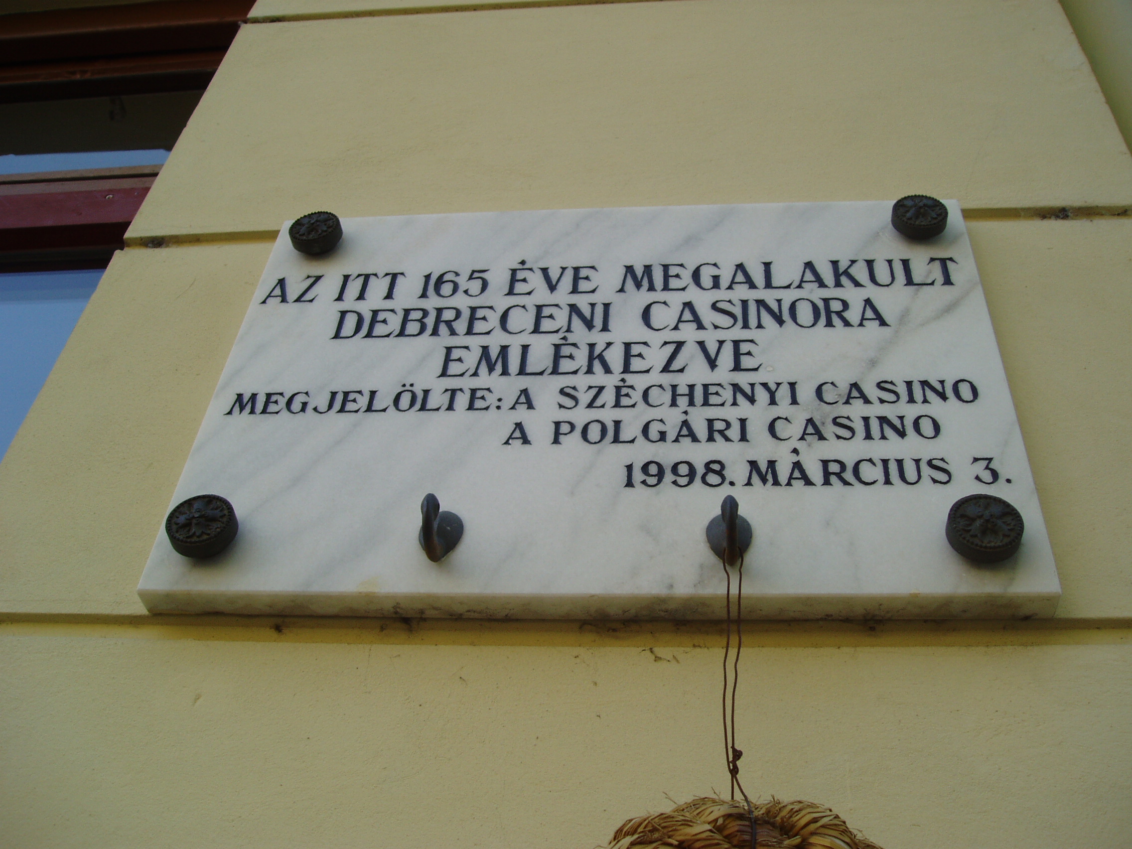 Nyilvános 1151 | 1748 | Debrecen, Piac utca 31. | Ennek a háznak az első emeletén alakult meg Debrecen első kaszinója 1833. márc. 30-án. 1849. ápr. 14-én este a trónfosztás (lásd: Debrecen, Kálvin tér) kimondása után ennek az épületnek azóta lebontott első emeleti erkélyéről beszélt Kossuth Lajos a néphez, amikor Könyves-Tóth Mihály lelkész a város közönsége nevében fáklyás-zenés felvonulás élén üdvözölte. Felh. irod.: Papp Antal: Debrecen. Bp. Panoráma, 1976 Kovács Gergelyné: Debrecen. Bp. Panoráma, 1981 |