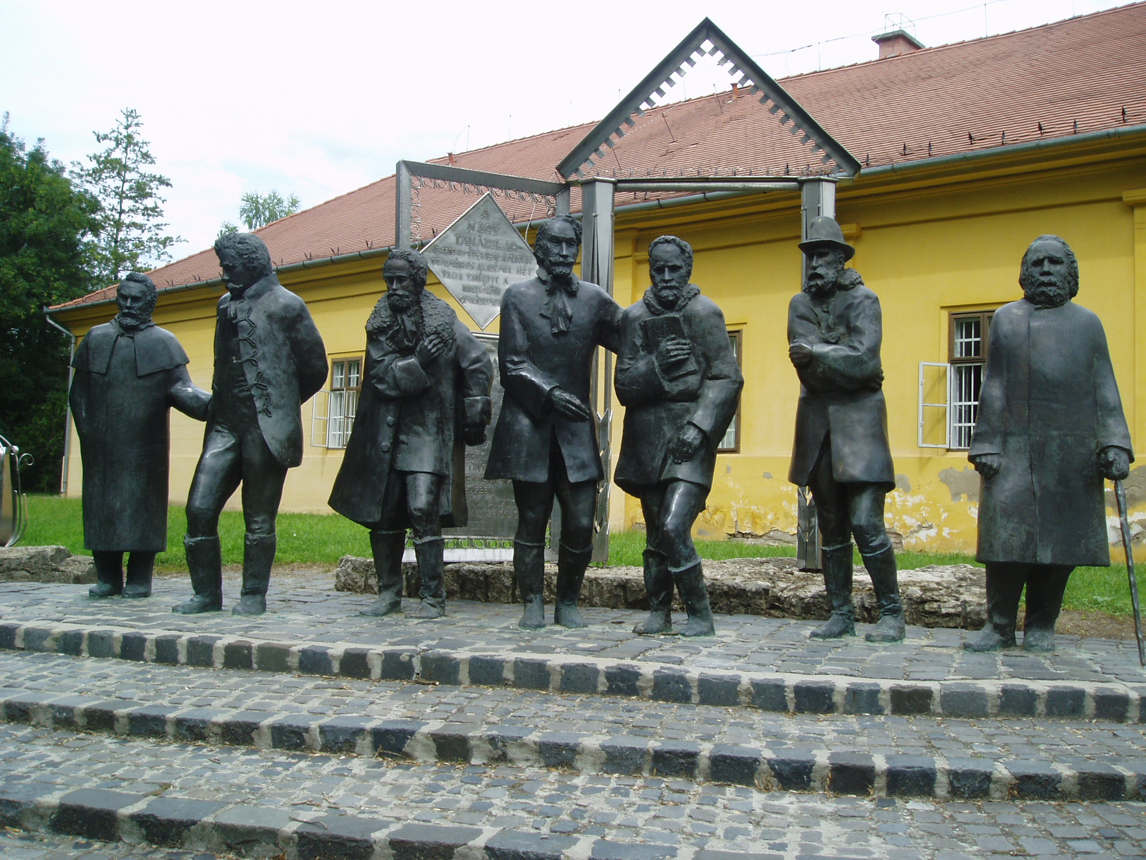 Nyilvános 1609 | 3654 | Nagykőrös, Ceglédi út 19. Arany János Múzeum. Varga Imre: Nagy tanári kar - szoborcsoport | Varga Imre: Nagy tanári kar című szoborcsoportját 1996. augusztus 20-án leplezték le az Arany János Múzeum épülete előtt. A szoborkompozíció a magyar kultúra azon kiemelkedő egyéniségeit örökíti meg, akik a Bach-korszakban a nagykőrösi gimnáziumban tanítottak, Nagykőrösön működtek. A legismertebb egyéniség, a nemzet halhatatlan költője, Arany János 1851-1860 között élt és alkotott Nagykőrösön. Mint ő írta egy levelében: a fél Akadémia Kőrösön van... A város történetének kiemelkedő egyéniségei továbbá Salamon Ferenc, Szilágyi Sándor történészek, Szabó Károly bibliográfus, Szász Károly költő, műfordító, református püspök, Szigethi Warga János neveléstörténész, Tomory Anasztáz matematikus és mecénás. A "Nagy tanári kar" működése Nagykőrös mezővárosi fejlődésének fénykorát reprezentálja. Ebben az időszakban Nagykőrös a magyar kultúra meghatározó központja volt, "magyar Weimar"-ként emlegették a várost, Arany Jánost pedig Goethe-hez hasonlították. Mindennek természetesen a politikai helyzet volt az oka: a szabadságharc utáni megtorlás időszakát átvészelt meghatározó értelmiségiek részben kiszorultak a Bach-korszak fővárosából, részben önként jöttek, mert egy kisvárosban szabadabban munkálkodhattak, s nagyon távolra mégsem kerültek Pesttől. A fénykép 2006 augusztusában készült. Felh. irod.: www.c3.hu/~pmiajm/hunnagyk.htm www.vendegvaro.hu Törös László: A nagykőrösi Arany emlékek katalógusa. = A nagykőrösi művelődés hármas kis tüköre. Nagykőrös, 1935 |