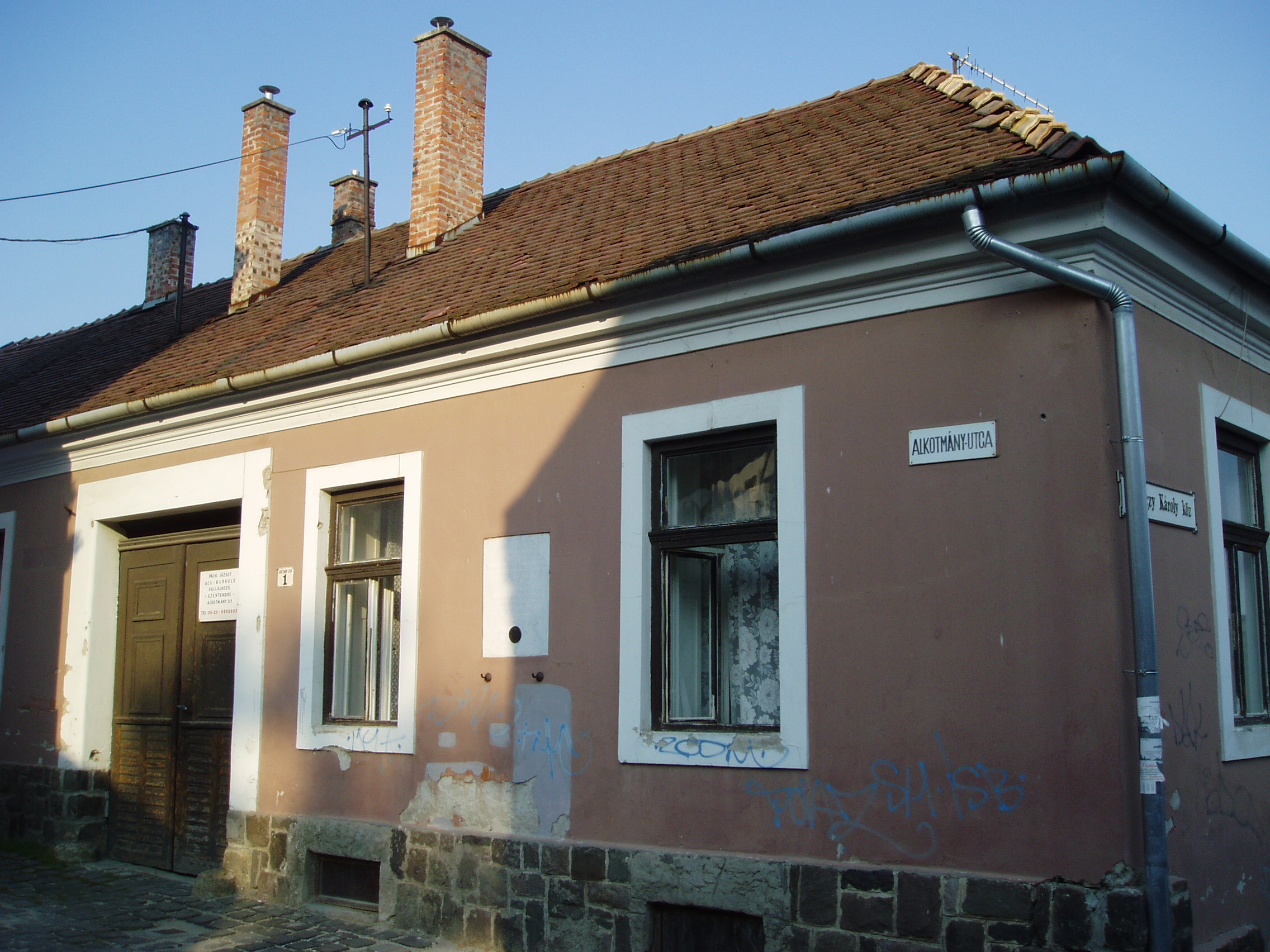 Nyilvános 1485 | 3404 | Szentendre, Alkotmány utca 1. | Ebben a házban élt 1889 és 1892 között Ferenczy Károly festőművész és felesége, Fialka Olga festőművész. 1890-ben itt születtek ikergyermekeik, akik mindketten halhatatlan alakjai a magyar képzőművészetnek: Ferenczy Béni szobrászművész és Ferenczy Noémi gobelinművész. A család legidősebb gyermeke, az 1885-ben született Ferenczy Valér is festőművész volt. A fénykép 2005 szeptemberében készült. |