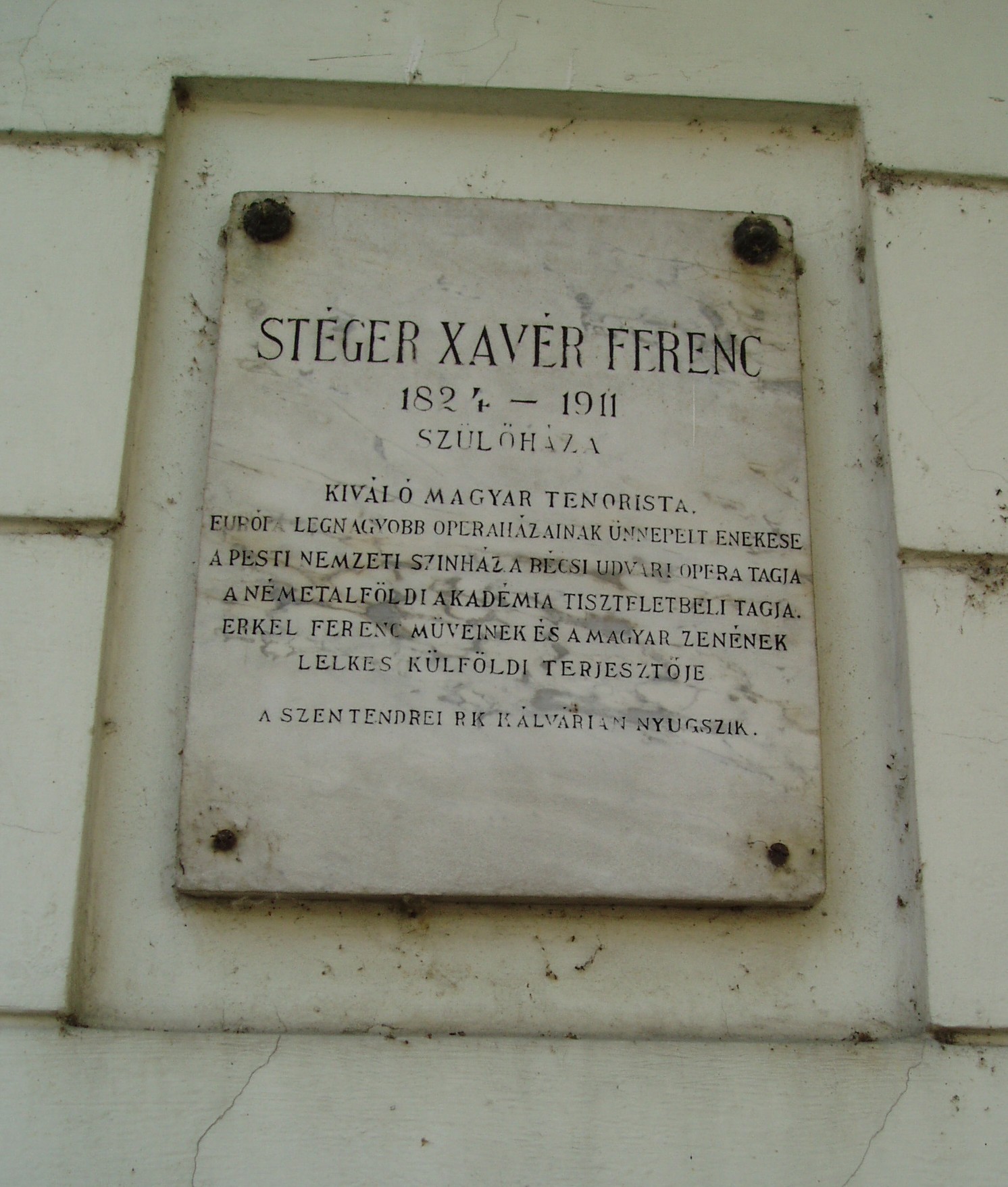 Nyilvános 1267 | 1961 | Szentendre, Dumtsa Jenő utca 10. | A XIX. zázadban épült polgárház 1978 óta a Barcsay Múzeum otthona. Barcsay Jenő (1900-) 1929-ben jött először Szentendrére, s azóta az év egy részét itt töltötte. Ezt írta a város szerepéről életében és művészetében: "Szentendrén éltem és Szentendrén alakítottam ki festészetemet, azt a valamit, amiért nekem érdemes volt küzdenem és élnem. A Szentendrén látott dolgokban, a természetben látott jelenségekben élet van, művészet van. Élnek azok a formák, színek, vonalak, amelyeket csak festő vehet észre..." A ház másik nevezetessége, hogy 1824. december 3-án itt született Stéger Ferenc (1824-1911) operaénekes. A patikusnak tanult fiatalember Európa–szerte híres hőstenorrá vált: rendszeresen vendégszerepelt Prágában, Bécsben, de énekelt Barcelonában, Bukarestben és Itália több színházában. 1848–1852 és 1873–1874-ben a pesti Nemzeti Színház tagja volt, Erkel színpadi hőseinek, valamint a francia és olasz tenorszerepeknek utolérhetetlen megszólaltatója. Élete alkonyán szülővárosába vonult vissza, itt hunyt el; a Katolikus Kálvária kertjében nyugszik. A fénykép 2005 szeptemberében készült. Felh. irod.: Szentendre. Szerk. Sándyné Wolf Katalin. Bp. Panoráma, 1985 Pethő Németh Erika- G. Sin Edit: Írók, költők Szentendrén. Szentendre, 1990 Erkel Ferencz emlékkönyv. Szerk. Fabó Bertalan. Bp. Pátria, 1910 |