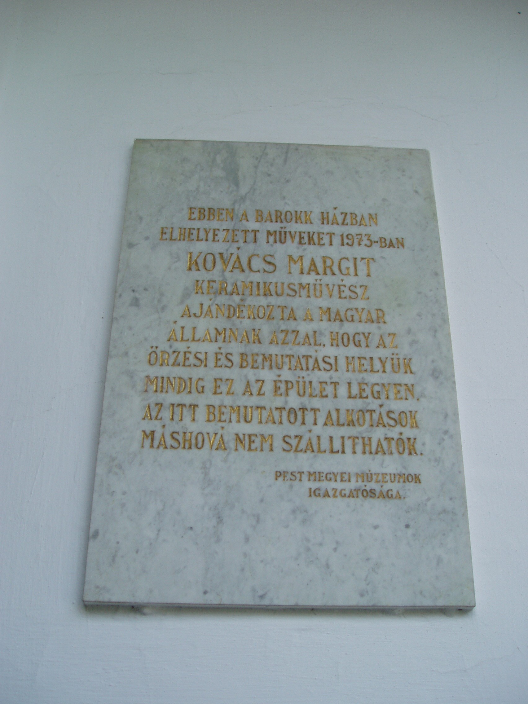 Nyilvános 1206 | 2171 | Szentendre, Vastagh Gy. utca 1. Kovács Margit Múzeum | Az 1759-ben emelt barokk stílusú épület előbb sóház, később plébánia, majd Dimsitz Vazul kereskedőháza, végül a Vastagh család lakóháza volt, mielőtt múzeumot alakítottak ki falai között. Kovács Margit (1902-77) keramikus, szobrász, a magyar kerámiaművészet egyik megújítója 1972-ben a múzeumnak adományozta életműve jelentős részét. Ezt mutatja be a kiállítás. Az épület múzeummá alakításakor a díszes barokk kapuzat mellett az 1929-es Korongos relief másolatát helyezték el. 1977-ben udvari épülettel bővítették a múzeumot. A legnagyobb alapterületű kiállító-helyiségben, a dongaboltozatos régi pincében az 1930-as, 1940-es években készült alkotások kaptak helyet, amelyekből a művész biblikus témájú művei emelkednek ki. Az emeleti galéria enteriőrje és fotódokumentációja Kovács Margit otthonának és műtermének állít emléket. A sajátos hangú alkotásoknak, a szépen kialakított múzeumi környezetnek köszönhetően éveken keresztül az országnak ebben a múzeumában fordult meg a legtöbb látogató. (Az épületbelsőben sajnos nem szabad fényképezni! K.K.) A fénykép 2005 szeptemberében készült. Felh. irod.: http://pmmi.hu/muzeumok/kovacsmargit/index.htm www.vendegvaro.hu |