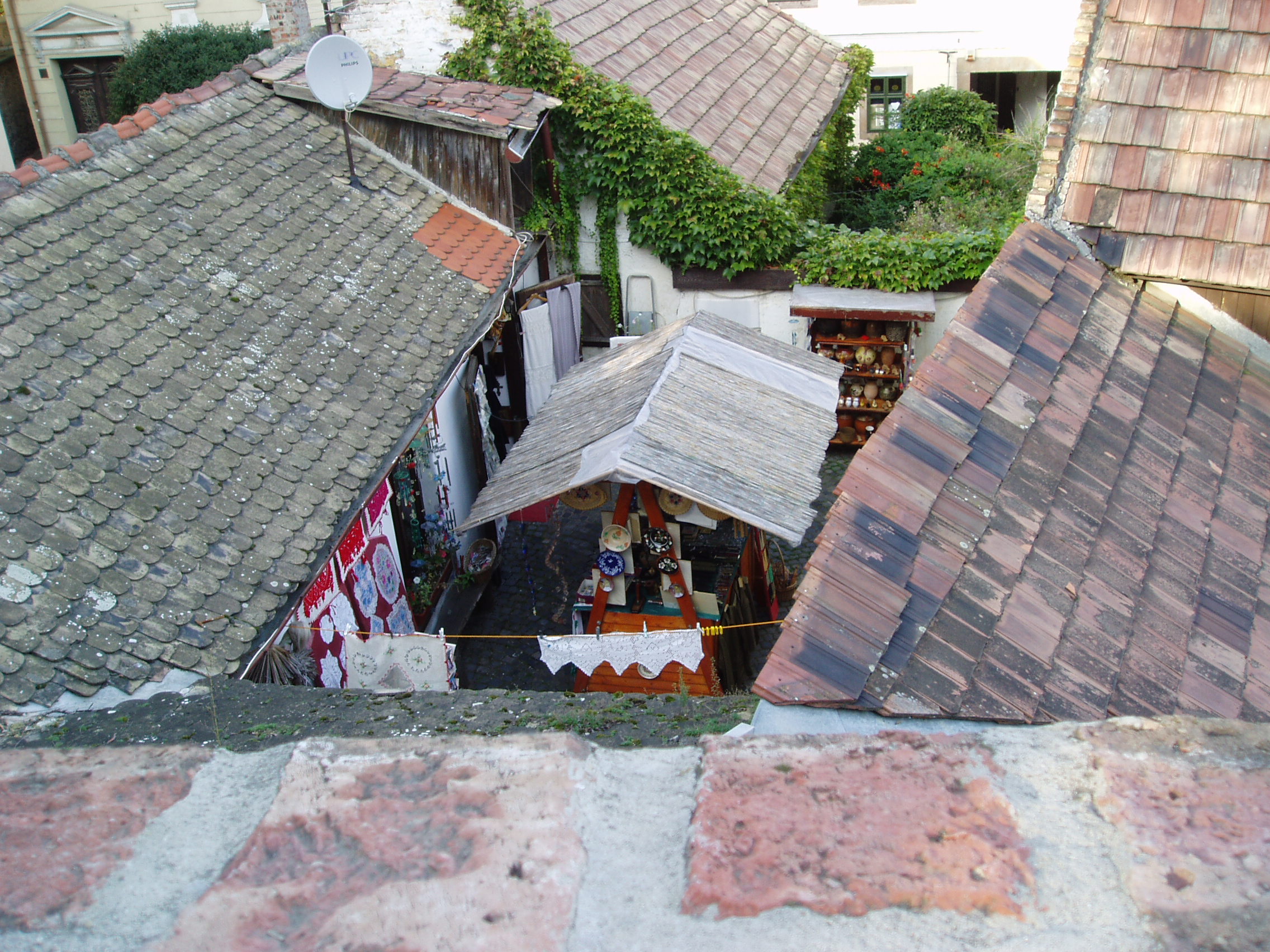 Nyilvános 1149 | 1864 | Szentendre, Várdomb | Szentendre egyik legszebb része a Várdomb, a település középkori központja. Tömör mellvéddel körülvett sétányáról megragadó látvány nyílik az oly sokszor megfestett szentendrei háztetőkre, a kis belső udvarokra, a belvárosra, a Dunára és a túloldali szigetre. A fénykép 2005 szeptemberében készült. Felh. irod.: Szentendre. Szerk. Sándyné Wolf Katalin. Bp. Panoráma, 1985 www.vendegvaro.hu www.szentendre.hu |