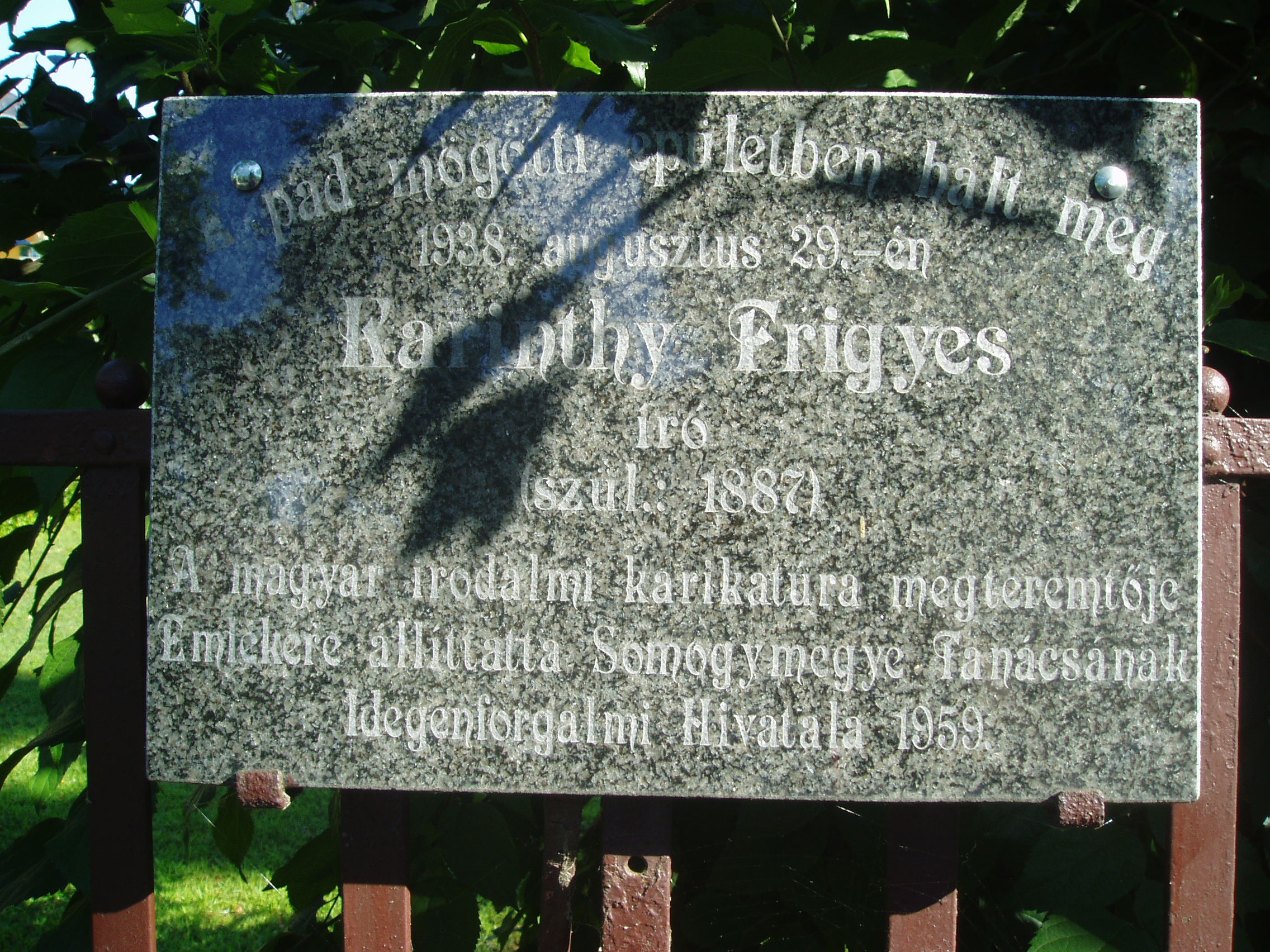 Nyilvános 1216 | 2196 | Siófok, Batthyány utca 46. | Siófok egyik legendás épülete és intézménye a volt Vitéz Panzió. Az épületet az akkori idők egyik legtehetségesebb művésze, a kiskorpádi születésu Kozma Lajos (1884-1948) Kossuth-díjas építész tervezte. Az évtizedek során számos nevezetes vendége volt. Az épület előtt támaszkodik a kerítésnek Karinthy Frigyes emlékpadja. Ebben a házban hunyt el 1938. augusztus 29-én a XX. század legegyetemesebb érdeklődésű és egyik legtermékenyebb magyar írója. Karinthy Frigyes - családjával együtt - évtizedeken keresztül volt a Vitéz Panzió viszatérő vendége. Az író imádta Siófok nyári hangulatát, vendéglőit, a kaszinók éjszakai mondén életét s a délutáni kártyacsatákat. A Stockholmban 1936-ban elvégzett agyműtét után még felépült, de két év múlva itteni szobájában agyvérzést kapott és meghalt. Utolsó estéjén még meglátogatta a panzióban jóbarátja, Rejtő Jenő. Karinthy Frigyes fiai, a tragikus sorsú költő, Karinthy Gábor és Cini, azaz Karinthy Ferenc író is nagyon sokat tartózkodtak itt. Karinthy Ferenc az itteni életet, ifjúságának csínyjeit számos írásában rögzítette. Faludy György költő is lakott a Vitéz-panzióban. “Itt nyaraltunk 1914-től 1918-ig minden nyáron. Apám akkor katona volt. A Batthyány utca 7.-ben laktunk a szüleimmel, illetve apámmal, aki a frontról egyszer meg is látogatott bennünket. Aztán később is megfordultam Vitéz Miklósné panziójában, amikor Karinthy Frigyes is itt nyaralt" - mesélte később a költő. Felmerült az ötlet, hogy az épületben létrehozzák Karinthy Frigyes emlékmúzeumát, de a megvalósítás még messze van. Viszont 1998-ban a Rózsakertben (a Balaton-parton) felállították egészalakos szobrát, Varga Tamás alkotását. A fénykép 2006 júliusában készült. Felh. irod.: http://www.siofok.hu/seta_a_varosban_hu.php Matyikó Sebestyén József: Zsidók Siófokon. Debrecen, Ethnica, 2000 |