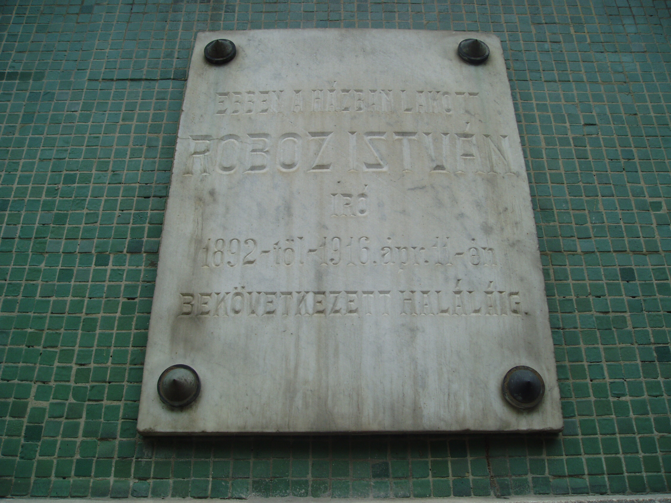 Nyilvános 1164 | 2167 | Kaposvár, Dózsa utca 16. | A korábban ezen a helyen állott házban lakott 1892-től 1916-ban bekövetkezett haláláig Roboz István író, szerkesztő. Halála után az eredeti épületet emléktáblával jelölték meg, amelyet 1996-ban áthelyeztek az itt felépített új épületre, egy kiegészítő szöveges táblával együtt. Roboz István (Kötcse, 1828. okt. 26. - Kaposvár, 1916. ápr. 11.): költő, író, újságíró. Pápán Petőfi és Jókai iskolatársa volt. Diákéveit "Petőfi Sándor és az én pápai emlékeim" című, forrásértékű visszaemlékezéseiben örökítette meg. A szabadságharc alatt kormánybiztosi titkár Kaposvárott. Végleg 1856-ban telepedett le a városban, ahol először törvényszéki bíróként, később főjegyzőként dolgozott. Nagy aktivitással kapcsolódott be a dél-dunántúli irodalmi életbe. 1866-ban megalapította a Somogy című lapot, amelyet haláláig szerkesztett. Elnöke volt a Somogy vármegyei Berzsenyi Társaságnak. Ő írta - a hagyomány szerint az ádándi kastélyban - 1849-ben a később több nyelvre is lefordított "Kossuth imája a kápolnai csatában elesettek felett" című verset, amelyet a helyszínen felolvasott Wesselényi Miklósnak és Kemény Zsigmondnak. Az ima az 1850-es években a legismertebb hazafias fohász volt. A fénykép 2006 márciusában készült. Felh. irod.: Életrajzi lexikon www.adand.hu |