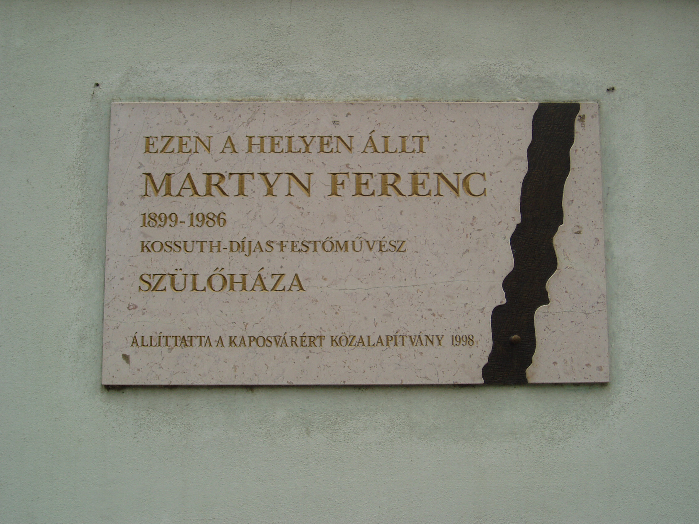 Nyilvános 1138 | 1888 | Kaposvár, Fő utca 70. | A mostani épület helyén egykor állott házban született 1899. június 10-én Martyn Ferenc (1899-1986) festőművész. Emléktábláját 1998-ban avatták fel. Rokona volt Rippl-Rónai Józsefnek, unokája Piacsek bácsinak, Rippl-Rónai egyik kedvelt modelljének. Édesnyja halála után gyermekkorát - fivérével, a legendás orvossá lett Martyn Róbert Alajossal együtt - Rippl-Rónai házában (lásd: Kaposvár, Róma-villa) töltötte. A fénykép 2006 márciusában készült. Felh. irod.: Martyn Ferenc: Visszaemlékezések Rippl-Rónai Józsefre. = Somogyi Almanach 3. Szerk. Kanyar József. Kaposvár, 1958 |