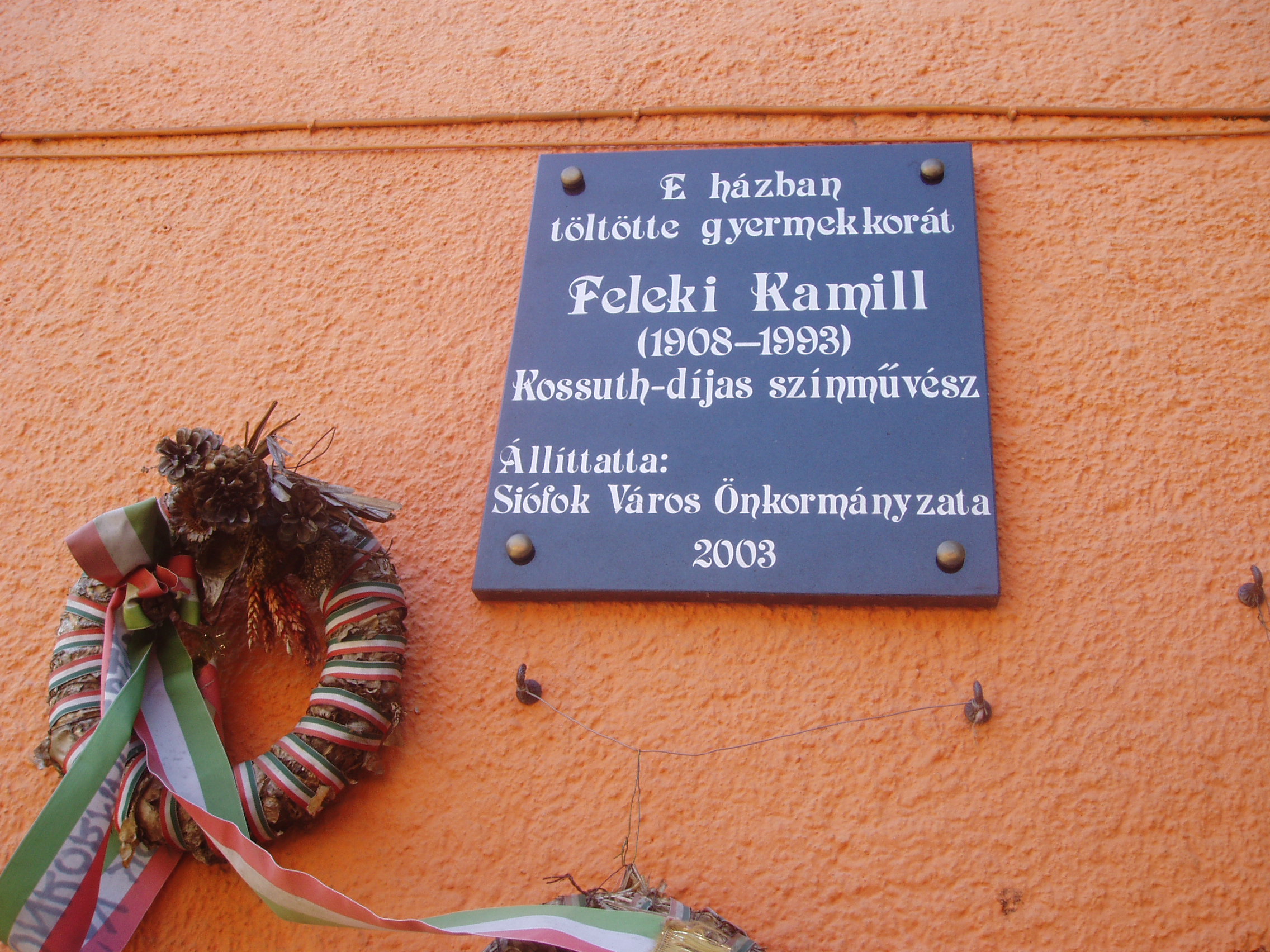Nyilvános 1242 | 2358 | Siófok, Kálmán Imre sétány 3. | A város szívében, a sétálóutca központi részén található az egykori Kovács cukrászda, amely ma Siófok egyik legkellemesebb hangulatú étterme. Homlokzatán Feleki Kamillra, az operett műfajának kimagasló egyéniségére emlékező fekete márványtábla fogadja a sétálót, aki gyermekkorában ebben a házban töltötte nyarait testvéreivel együtt. A házban apai nagyszülei vezették az akkori vendéglőt. A fénykép 2006 júliusában készült. Felh. irod.: Matyikó Sebestyén József: Feleki Kamill és Siófok. = Siófoki Hírek 2003. júl. 23. |
