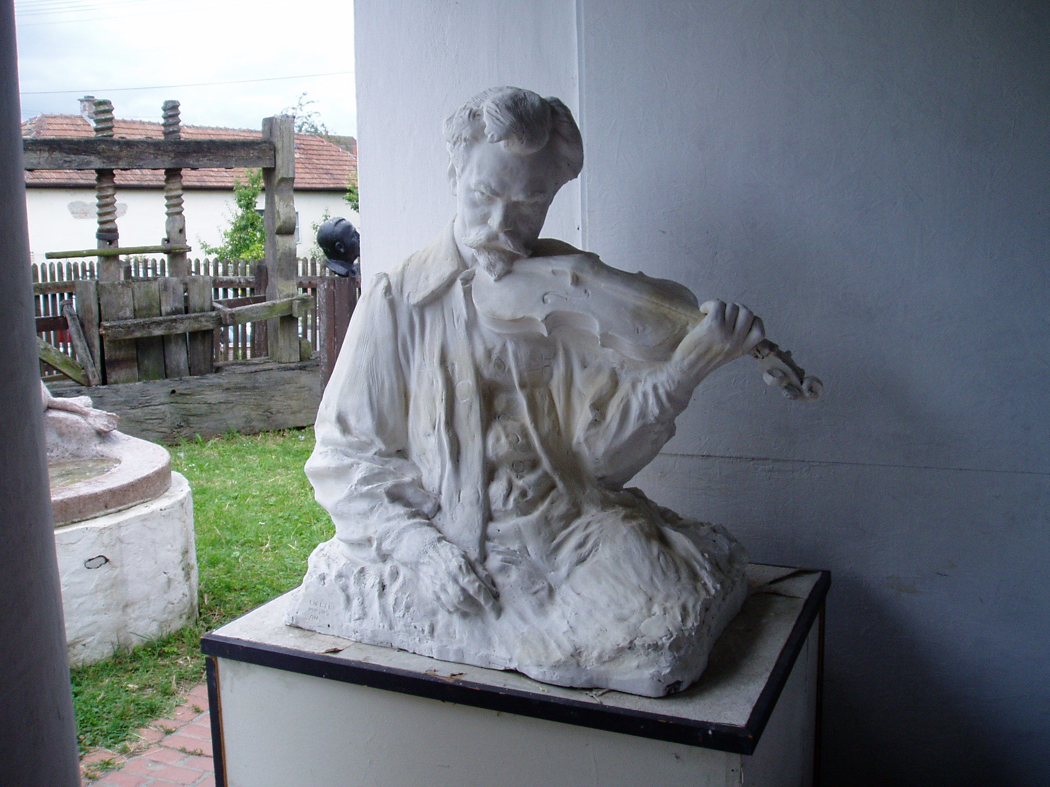 Nyilvános 1613 | 4442 | Balatonlelle, Kossuth utca 35. Kapoli Múzeum | Az 1700-as évek végén épült, szépen rendbe hozott parasztház ad otthont a Kapoli Múzeumnak. A földszinten két állandó kiállítást, a tetőtérben neves kortárs művészek időszaki kiállítását tekintheti meg a közönség. Láthatók idősebb és ifjabb Kapoli Antal somogyi pásztor-faragómesterek, kiváló népművészek munkái és Ligeti Miklós szobrászművész - többek között az Anonymus és Déryné szobrok alkotójának, Rodin tanítványának - művei. A képen: Ligeti Miklós Hubay Jenő hegedűművészről és zeneszerzőről készített portrészobra. A fénykép 2005 júliusában készült. Felh. irod.: Ligeti Gábor: Balatonlelle. Lellei séták. Bp. Tájak, Korok, Múzeumok Kiskönyvtára 559. 1998 |