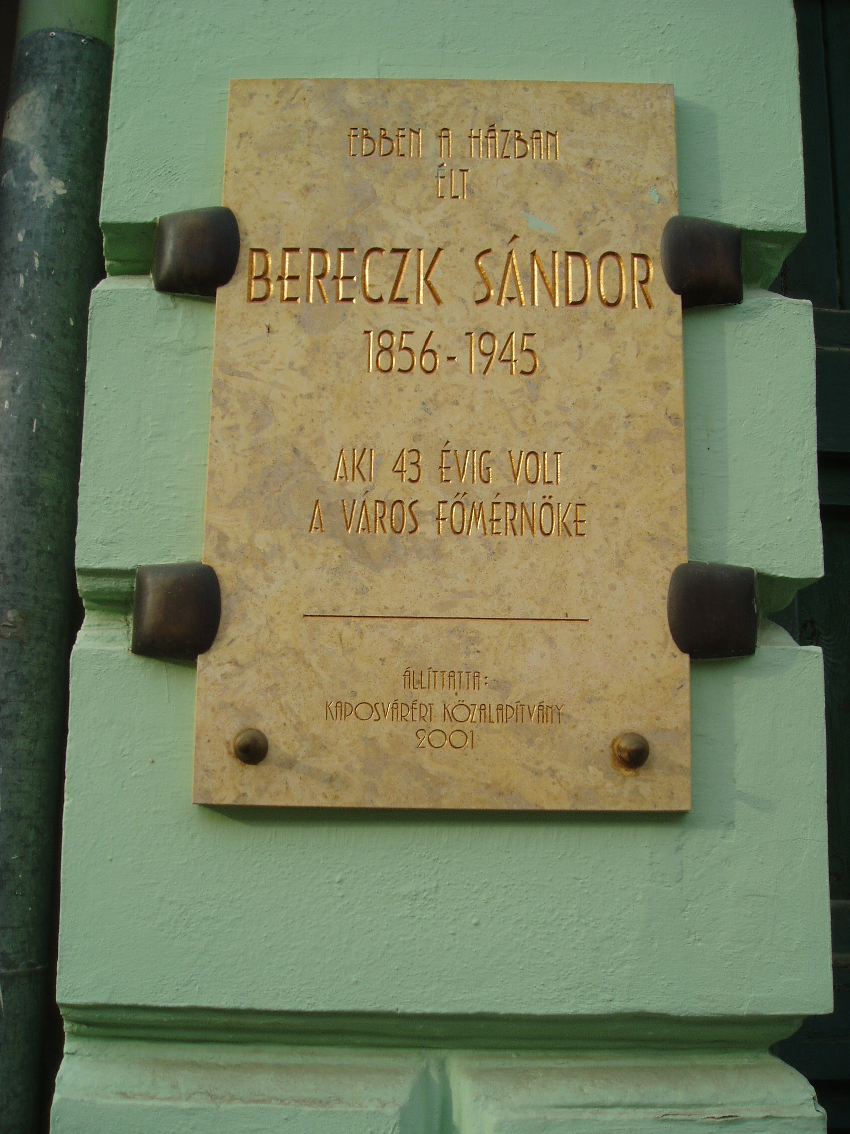 Nyilvános 1128 | 1753 | Kaposvár, Fő utca 5. | Kaposvár belvárosának épületeit nagyrészt a XIX. század második felében és a XX. század első két évtizedében emelték. A döntően eklektikus és kisebb számban szecessziós stílusú épületek nem képviselnek kiemelkedő építészeti értéket, de együttesen sajátos hangulatú utcaképet alkotnak. A Fő utca 5. számú épület a Bereck család háza volt. Mint a homlokzatán elhelyezett emléktáblán is olvasható, ebben a házban élt Bereck Sándor (1856-1945), aki több, mint négy évtizeden át a város főmérnöke volt. Ő tervezte az eklektikus stílusú Kálvária kápolnát (Kaposvár, Kálvária u. 15.). A fénykép 2006 márciusában készült. Felh. irod.: Kaposvár és környéke. Kaposvár, Infomark, 2002 |