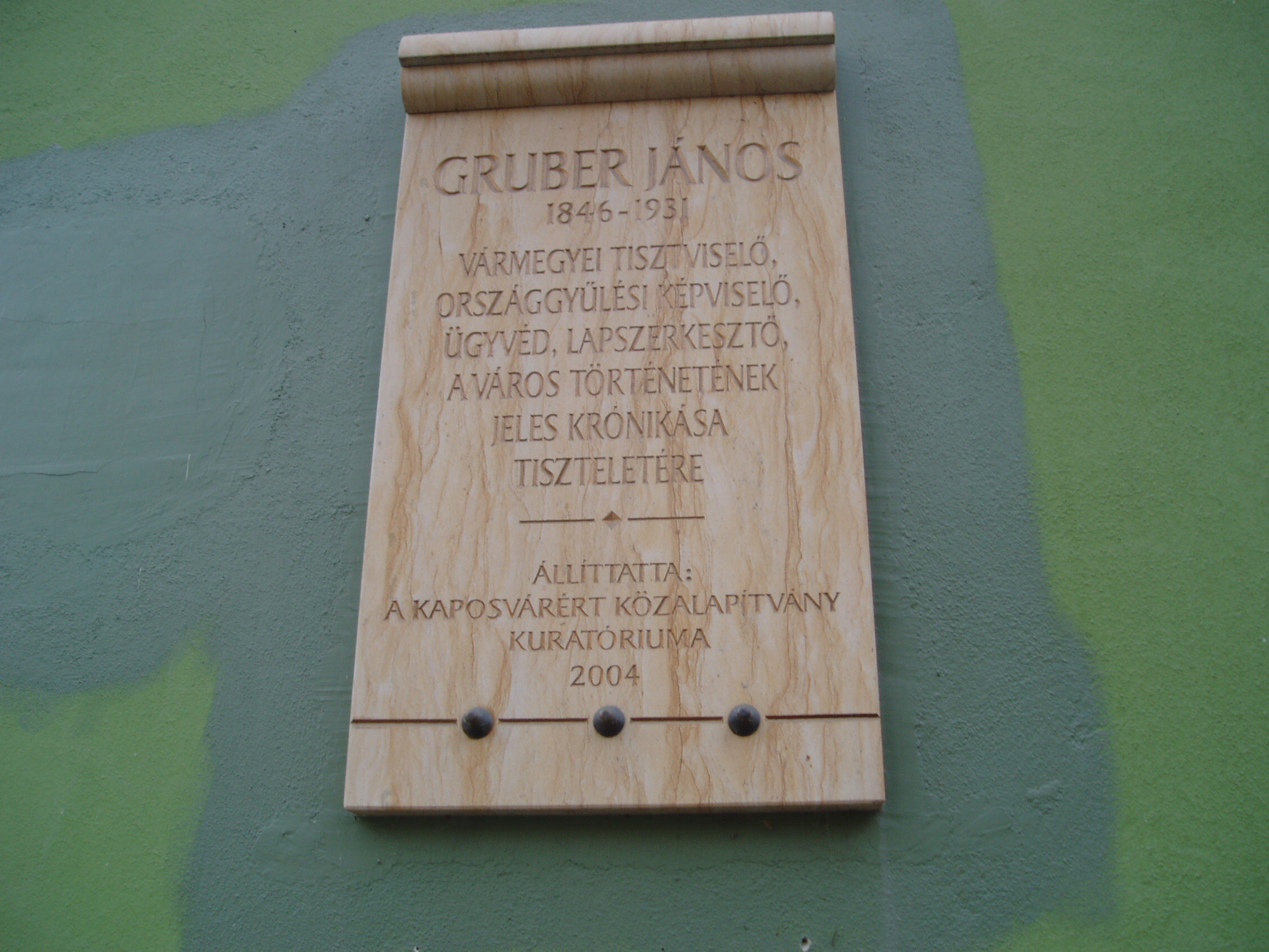 Nyilvános 1205 | 1912 | Kaposvár, Zárda utca 7. | A Somogyi Hírlap épületének homlokzatán 2004-ben avatták fel Gruber István emléktábláját (eredetileg a Városházára tervezték, mert ott volt a munkahelye). Gruber János (1846-1931) jogász, segédszolgabíró, 48-as párti országgyűlési képviselő, pénzügyi tisztviselő, publicista. Két jelentős írással ajándékozta meg Kaposvár városát. Az első 1913-ban jelent meg “Morzsák a negyvenéves asztalról” címmel, a második korrajzot 1928-ban “Morzsák az ötvenéves asztalról” címmel írta meg. A fénykép 2006 márciusában készült. Felh. irod.: http://www.somogyitemetkezes.hu/temetok.php?id=65 |