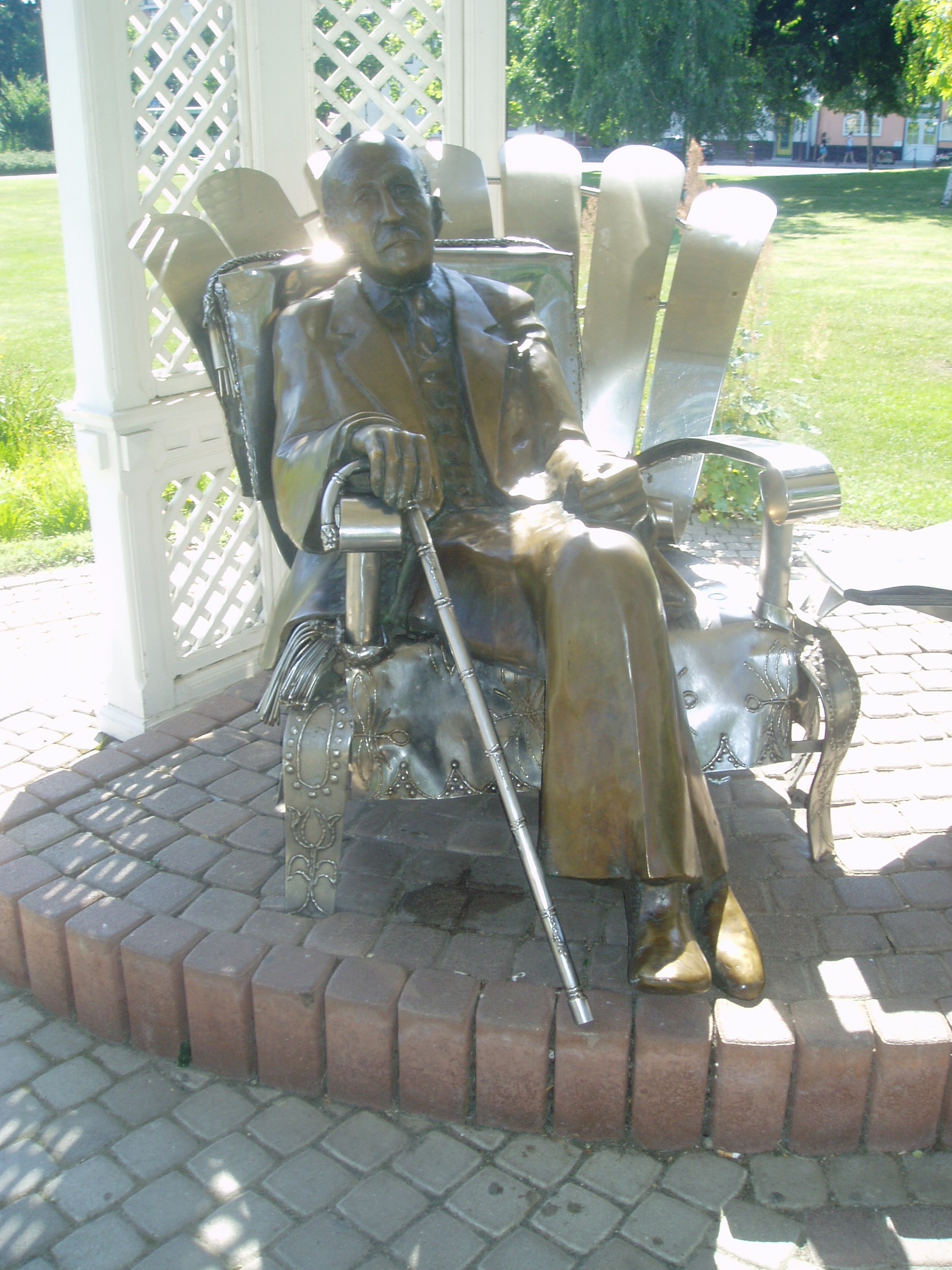 Nyilvános 1183 | 1998 | Siófok, Millennium park. Varga Imre: Kálmán Imre | Az 1920-ban épült, hajdani pompájában felújított állomásépület előtt 1994-ben készült el a 16 ezer négyzetméteres Millennium park. Gyönyörű pázsit, különleges cserjék, virágok, szobrok, tavacska, este díszkivilágítás ékesíti a területet. Itt állították fel - stílszerű környezetben, egy zenepavilonban - a város nagy szülötte (lásd: Siófok, Kálmán Imre sétány 5.), Kálmán Imre szobrát, mely karosszékben ülve, enteriőr–szerű környezetben ábrázolja a világhírű operettszerzőt. Az 1997-ben felavatott szobrot Varga Imre készítette, aki maga is siófoki születésű és számos alkotása tekinthető meg a városban (lásd: Siófok, Fő tér). Az ő alkotása a Művészeti iskola előtt álló Bartók–szobor is (lásd: Siófok, Mártirok útja 5.). A fénykép 2006 júliusában készült. http://www.siofok.hu/seta_a_varosban_hu.php |