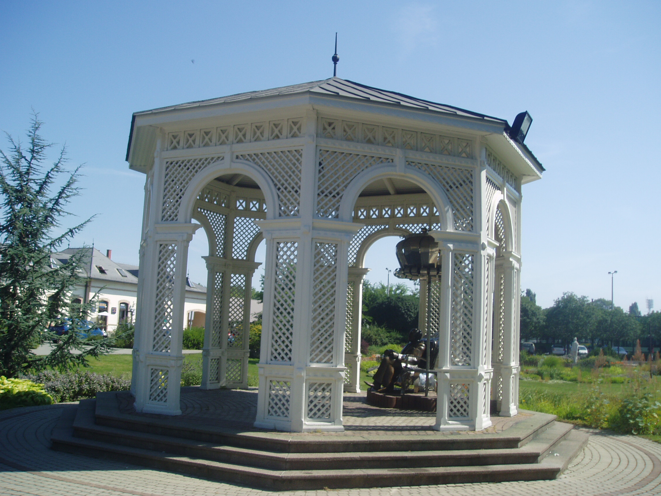 Nyilvános 1227 | 2602 | Siófok, Millennium park. Varga Imre: Kálmán Imre | Az 1920-ban épült, hajdani pompájában felújított állomásépület előtt 1994-ben készült el a 16 ezer négyzetméteres Millennium park. Gyönyörű pázsit, különleges cserjék, virágok, szobrok, tavacska, este díszkivilágítás ékesíti a területet. Itt állították fel - stílszerű környezetben, egy zenepavilonban - a város nagy szülötte (lásd: Siófok, Kálmán Imre sétány 5.), Kálmán Imre szobrát, mely karosszékben ülve, enteriőr–szerű környezetben ábrázolja a világhírű operettszerzőt. Az 1997-ben felavatott szobrot Varga Imre készítette, aki maga is siófoki születésű és számos alkotása tekinthető meg a városban (lásd: Siófok, Fő tér). Az ő alkotása a Művészeti iskola előtt álló Bartók–szobor is (lásd: Siófok, Mártirok útja 5.). A fénykép 2006 júliusában készült. http://www.siofok.hu/seta_a_varosban_hu.php |