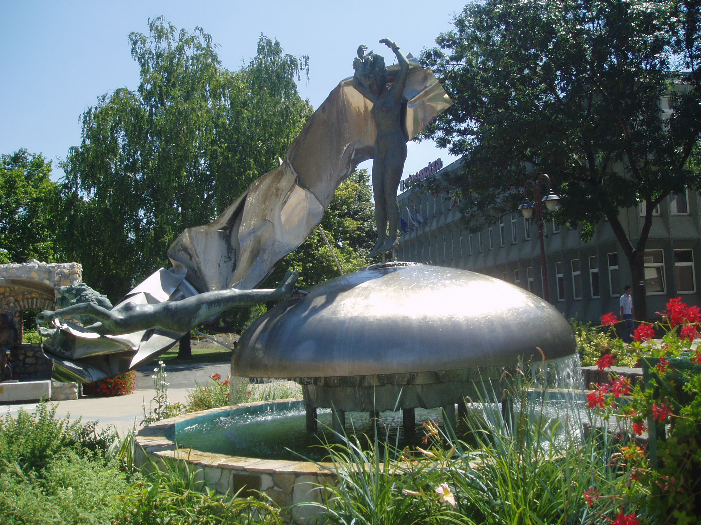 Nyilvános 1248 | 2839 | Siófok, Fő tér: Varga Imre: Vénusz születése | Varga Imre szobrászművész 1923. november 1-jén született Siófokon. Már gyermekkorában - a siófoki elemi iskolában - rendkívül jó rajzkészségével tűnt ki. 13 évesen szerepelt egy képével Párizsban. A képzőművészet terén elért kimagasló érdemeiért, amellyel Magyarország és Siófok város hírnevét is öregbítette, 1985-ben ő lett Siófok város első díszpolgára. Hazai és külföldi tereken, templomokban, középületekben mintegy 300 alkotását helyezték el. Szobrai állnak Belgiumban, Franciaországban, Lengyelországban, Németországban, Norvégiában és Izraelben. Siófokon a Fő téren szabadtéri szoborkiállítása látható. 1988-ban készült alkotása, a "Vénusz születése" a víz, a nap és a szél hármas egységét jeleníti meg. A fénykép 2006 júliusában készült. Felh. irod.: http://www.siofok.com/uj/object/varga-hu.html http://www.siofok.hu/szobor_venusz_szuletese.php |
