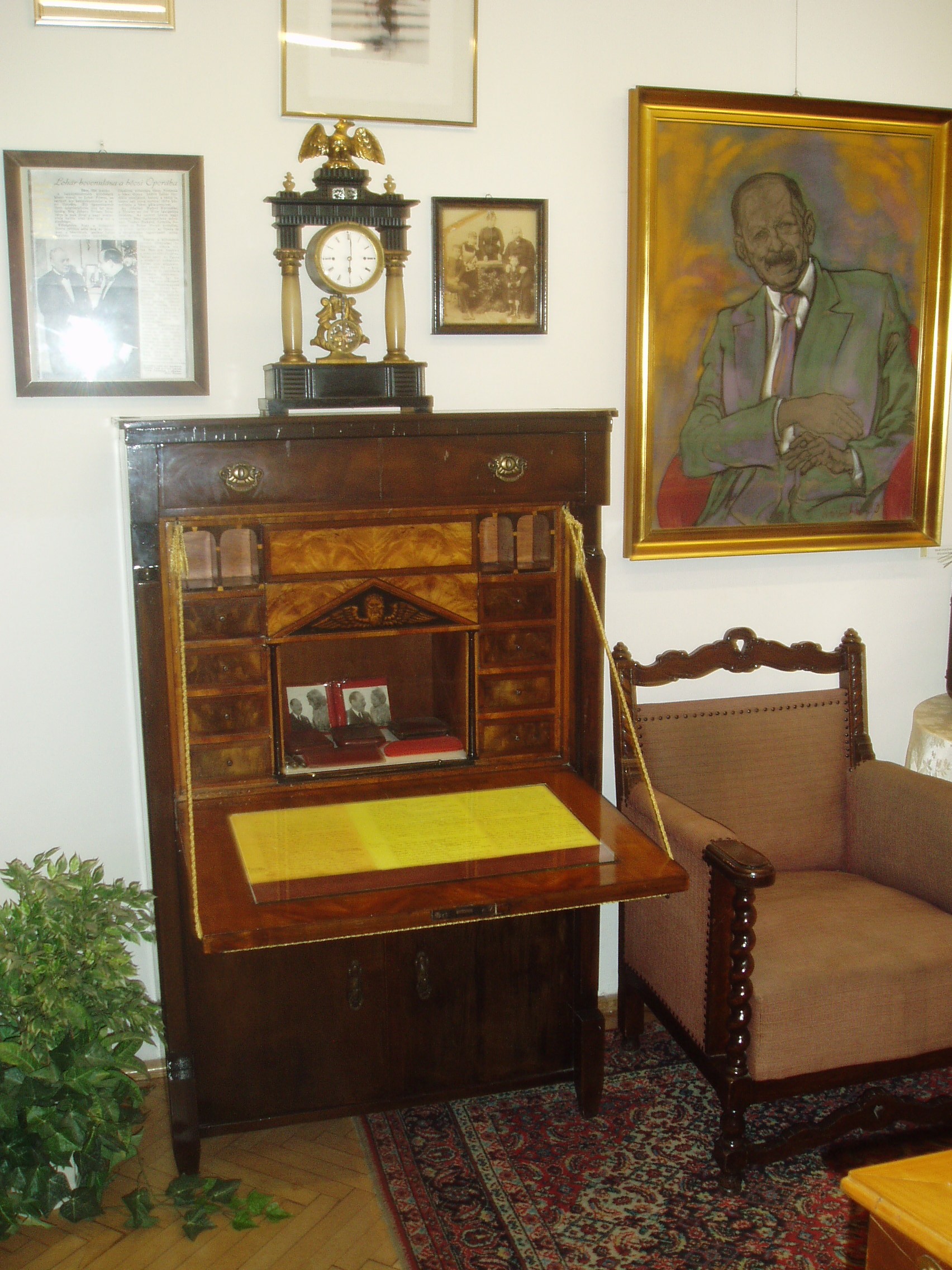 Nyilvános 1241 | 1957 | Siófok, Kálmán Imre sétány 5. | Ebben a vasútállomáshoz közeli házban született 1882-ben a magyar operett egyik legjelentősebb zeneszerzője, Kálmán Imre. Szülőházában — amelyet először 1955-ben jelöltek meg emléktáblával — 1970-ben özvegye, Kálmán Vera jelenlétében emlékszobát avattak. A mostani, gazdagabb anyagú emlékmúzeumot a zeneszerző születésének 105. évfordulója alkalmából, 1987. október 22-én nyitották meg. Jelenleg az emlékmúzeum a szülőház földszinti termeiben található, az emeleten kortárs képzőművészeti időszaki kiállításokat szoktak rendezni. Kálmán Imre számos személyes tárgyát állították itt ki enteriőr-szerűen. A tárgyak között látható látható Kálmán Imre kedves karosszéke és szekretere, amelyen sok gyönyörű dallamot vetett papírra. A fénykép 2006 júliusában készült. Felh. irod.: Kálmán Imre Múzeum Siófok. Szerk. Koch József. Siófok, 2000 http://www.kalmanimre-muzeum.hu/ |