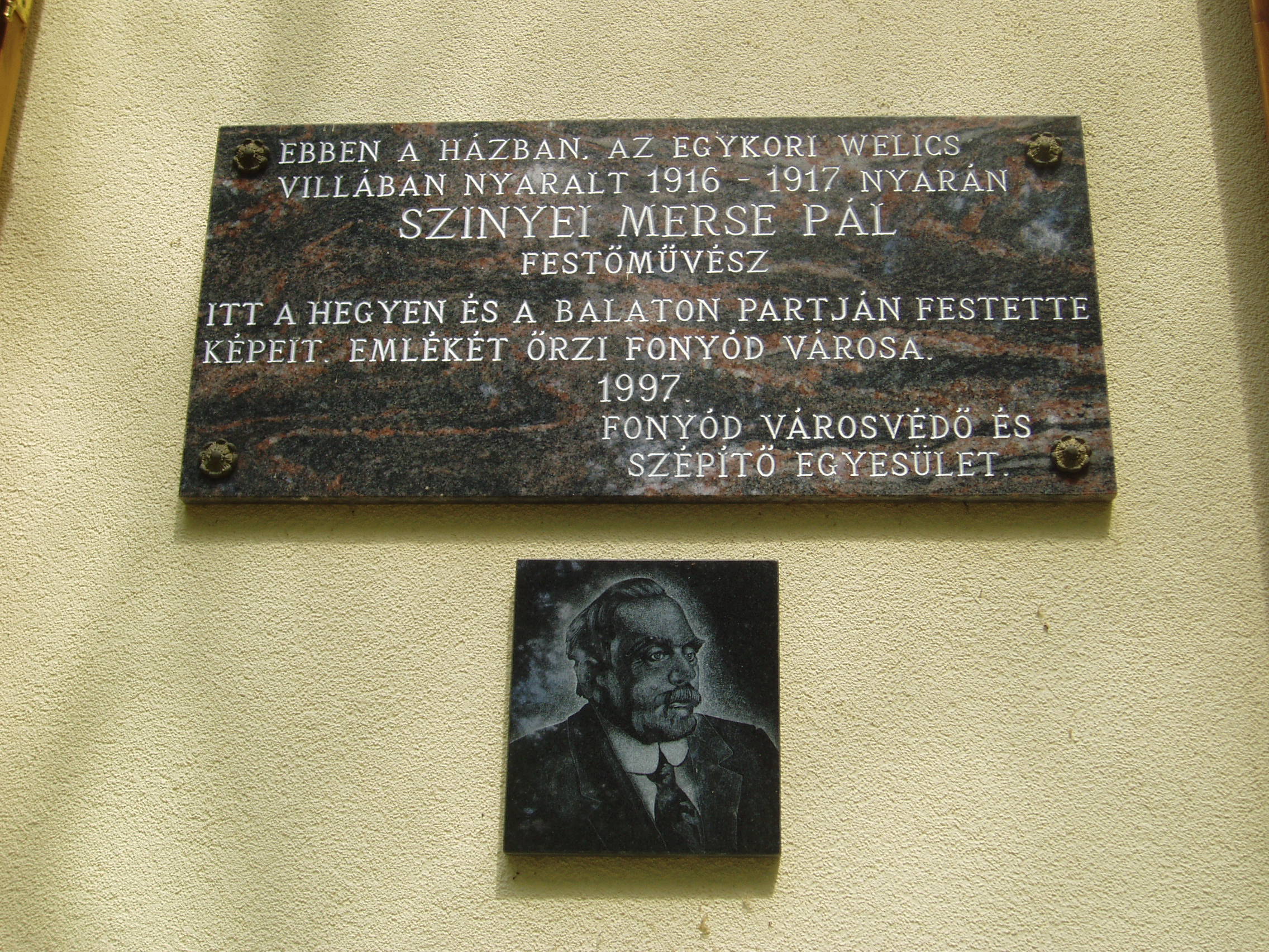 Nyilvános 1200 | 1976 | Fonyód, Bartók Béla utca 3. Természetvédelmi és Helytörténeti Múzeum | A fonyódi Várhegyen kialakult Bélatelephez tartozó, a Balaton egyik legszebb panorámájú helyén álló villát az orvosi doktorátussal rendelkező, többek között Kelet-kutatóként is számon tartott lászlófalvi Velics Antal (1875-1915) építtette az 1900-as évek elején. Ebben a villában töltötte 1916 és 1917 nyarát Szinyei Merse Pál (1845-1920), hazánk egyik legkiválóbb festőművésze. Az idős mester a háború miatt nem tuditt Jernyére, kedves szülőföldjére utazni, mint általában minden nyáron, így került Fonyódra. Vele tartott akkor már özvegy leánya és annak két kisfia. A csintalan gyerekekre Molnár C. Pál festőművész, akkor másodéves növendék vigyázott, aki emlékeit 1944-ben publikálta a Szépművészet c. folyóiratban. Szinyei Merse az első nyáron hat, a másodikon négy képet festett - köztük a Háborgó Balaton, A Balaton a fonyódi partról, a Kilátás Fonyódról című képeket. Alkotás közben nem zavarhatta senki, családtagjai sem. Érdekes módon a művész kerülte, hogy, szemből ábrázolja Badacsonyt. Nem szerette a hegyet, mely szerinte méretével és koporsó formájával megbontja a túlsó part harmonikus összképét. Szinyei Merse Pál emléktábláját 1997-ben avatták fel az épület falán. Az avatóbeszédet a festőművész dédunokája, Szinyei Merse Anna muzeológus tartotta. Az egykori Velics-villa az 1980-as évek végéig moziként üzemelt. Felújítása után, 2004-ben nyílt meg termeiben a fonyódi Természetvédelmi és Helytörténeti Múzeum. Benne a Fonyód történetét és néprajzát bemutató állandó kiállítás mellett időszaki kiállításokat is rendeznek. A fénykép 2007 júliusában készült. Felh. irod.: http://muzeum.fonyod.hu/ Molnár C. Pál: Szinyei Merse Pál Fonyódon. = Szépművészet 1944. március Szinyei Merse Anna: Szinyei Merse Pál élete és művészete. Bp. Corvina, 1990 Szinyei Merse Félix: Szinyei Merse Pál fonyódi nyaralása. = Magyar Nemzet 1983. július 19. |
