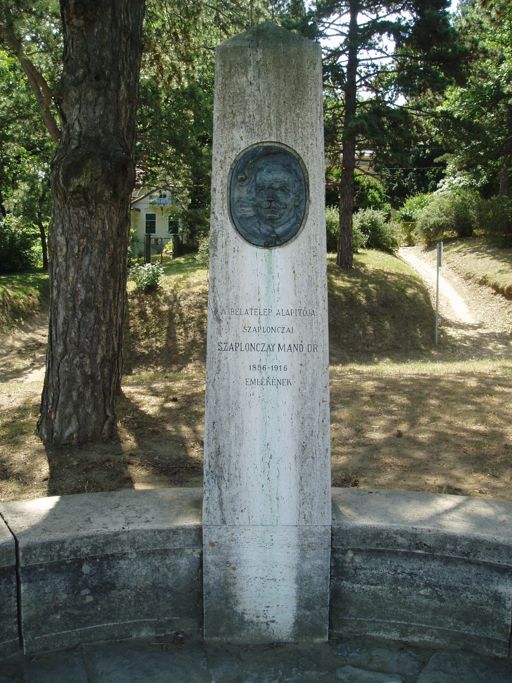 Nyilvános 1170 | 2466 | Fonyód, Márffy tér: Szaplonczay Manó emlékoszlopa | A híres Bartók Béla úti fonyód-bélatelepi villasorral átellenben, a sétányon haladva Szaplonczay Manó (1856-1916) emlékoszlopa látható, amelyet Bélatelep alapítója előtt tisztelegve 1934-ben emeltek. Az emlékoszlophoz, amelyet félkörben kőpad vesz körül, öt lépcső vezet. Az emlékművet Gerlóczy Gedeon műépitész tervezte, a rajta elhelyezett bronz-dombormű Horvay János szobrászművész alkotása. Két oldalán gránittáblákat állított a Fonyód Városvédő és Szépítő Egyesület, illetve egy kopjafa is az ő emlékét idézi. Szaplonczay Manó Somogy vármegye tisztifőorvosa volt. Ő építtette a marcali kórházat. Tiszti főorvosként sokat foglalkozott a fertőző betegségekkel, igyekezett terjeszteni a védőoltásokat. Sikerrel küzdött a csecsemőhalandóság ellen is. A fonyódi Várhegyen ő alapította meg a gróf Zichy Béláról (lásd: Fonyód, Bartók u. 3.) elnevezett Bélatelepet, s ezzel sokat tett a Balaton idegenforgalmának megteremtéséért. 1894-ben Kaposváron ötven alapítóval létrehozta a Fonyódi Nyaralók Társaságát. Hatvan éves korában, 1916. szeptember 3-án hunyt el. Ahogy kívánta, az általa alapított Bélatelepen, Balatonra nézve temették el a Várhegyen. A fénykép 2007 júliusában készült. Felh. irod.: http://konyvtar.fonyod.hu/szapmano.htm Szerdán avatták fel Fonyódon a Szaplonczay-emlékművet. = Új Somogy. 1934. augusztus 17 www.somogyitemetkezes.hu/temetok.php?id=179 |