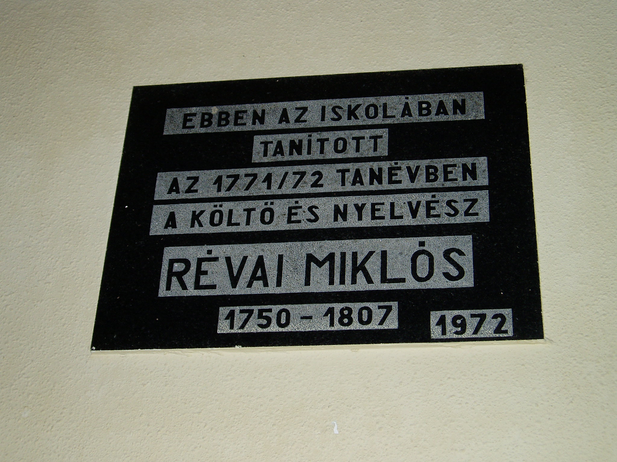 Nyilvános 1516 | 3116 | Tata, Tanoda tér 5. Eötvös József Gimnázium: Révai Miklós emléktáblája | A tatai gimnáziumot 1765-ben gróf Esterházy Miklós alapította, s vezetésére a piarista tanítórendet kérte fel. Az iskola kezdetben a közeli majki kamalduli szerzetesek többször is átalakított gazdasági épületeiben működött. A jelenlegi iskolaépületet a XX. század elején emelték, 1912-ben kezdődött meg benne a tanítás. Az első emeleti folyosó falán neves egykori tanárok és diákok emléktábláit helyezték el. Révai Miklós (1750-1807) költő és nyelvész 1771/72-ben volt a tatai gimnázium tanára. A magyar felvilágosodás kiemelkedő képviselője volt. Méltán nevezhetjük kora polihisztorának - irodalmár, nyelvész kiváló tanáregyéniség volt. Részt vett az irodalmi és tudományos közéletben, a Magyar Tudós Társaság létrehozásában, értett a rajzhoz és az építészethez. Maga is írt és fordított verseket; Rájnis Józseffel és Baróti Szabó Dáviddal a klasszikus triász tagjaként a magyar időmértékes verselés egyik meghonosítója. Életművének jelentőségét hegedűs Géza így summázta: "Egész szépirodalmi munkássága csak szellemi kirándulás volt a valószínűtlenül sokoldalú tudósnak és tanítónak és újságírónak és építészetért, rajzért lelkesedő művészeti szakembernek, aki mindenekelőtt nyelvész: a magyar nyelvtudomány legfőbb klasszikusa, az összehasonlító nyelvészet nemzetközi előfutárainak egyike, a magyar tudománytörténet egyik múlhatatlan büszkesége." A fénykép 2005. júliusában készült. Felh. irod.: www.eotvos-tata.sulinet.hu Wehner Tibor: Tatai szobrok, emlékművek, emléktáblák. Tata, 1980 Hegedűs Géza: A magyar irodalom arcképcsarnoka. Bp. Móra Kiadó, 1976 |