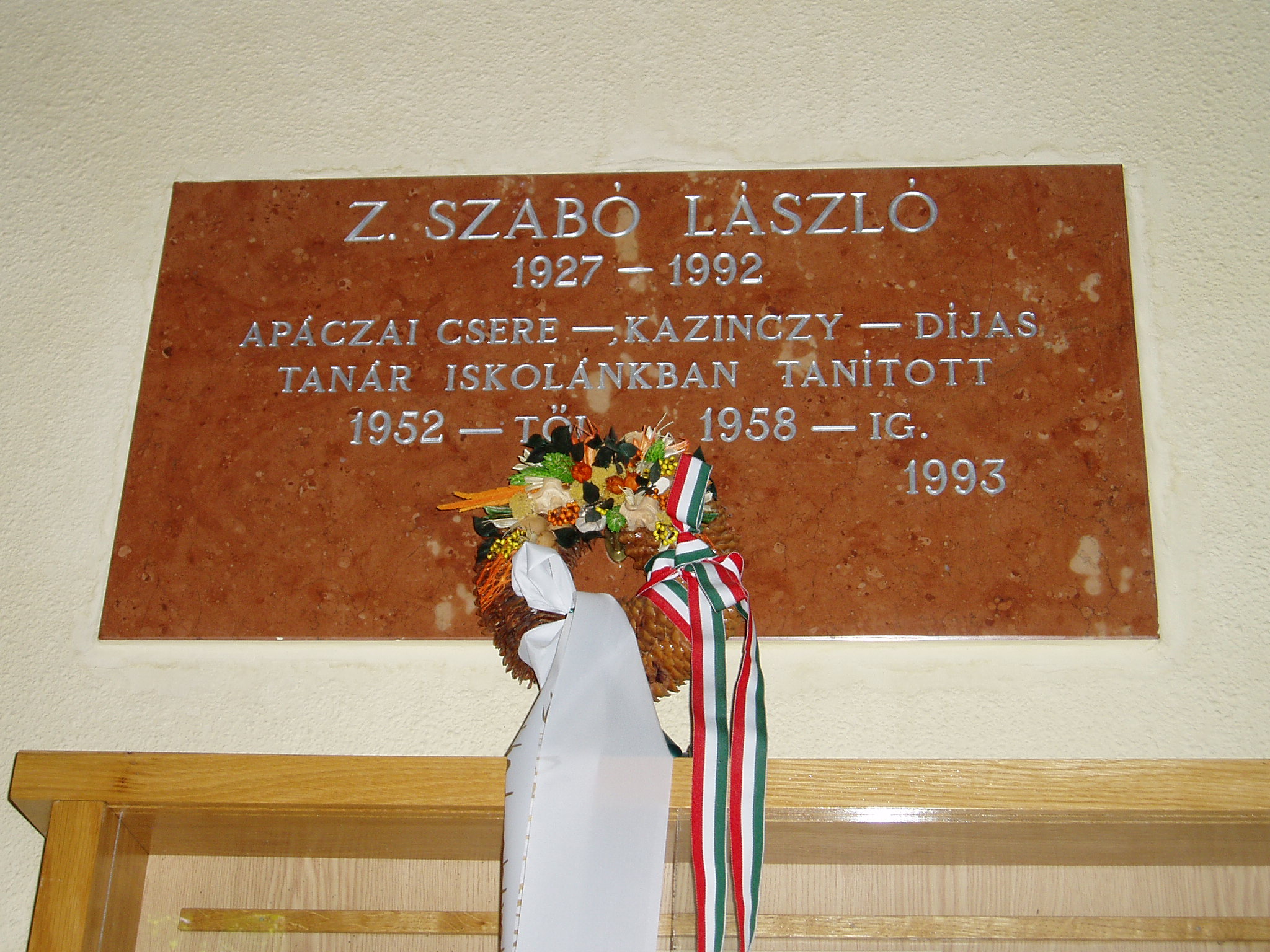 Nyilvános 1421 | 3266 | Tata, Tanoda tér 5. Eötvös József Gimnázium: Z. Szabó László emléktáblája | A tatai gimnáziumot 1765-ben gróf Esterházy Miklós alapította, s vezetésére a piarista tanítórendet kérte fel. Az iskola kezdetben a közeli majki kamalduli szerzetesek többször is átalakított gazdasági épületeiben működött. A jelenlegi iskolaépületet a XX. század elején emelték, 1912-ben kezdődött meg benne a tanítás. Az első emeleti folyosó falán neves egykori tanárok és diákok emléktábláit helyezték el. Z. Szabó László (1927-1992) irodalmár 1952 és 1958 között volt a gimnázium tanára. Későbbi élete Győrhöz kötötte. Az 1960-as, 1970-es években az országos hírnevű Győri Ifjúsági Irodalmi Színpad dramaturgjaként működött. A Kazinczy Anyanyelvi és Szépkiejtési Verseny egyik életre hívója, s a Radnóti Miklós Emlékbizottság első titkáraként a Költészeti Biennálé és a Radnóti Miklós Országos Felnőtt Amatőr Vers- és Prózamondó Verseny létrehozója volt. A fénykép 2005. júliusában készült. Felh. irod.: www.eotvos-tata.sulinet.hu Németh András: In memoriam Z. Szabó László. = www.versmondo.hu |