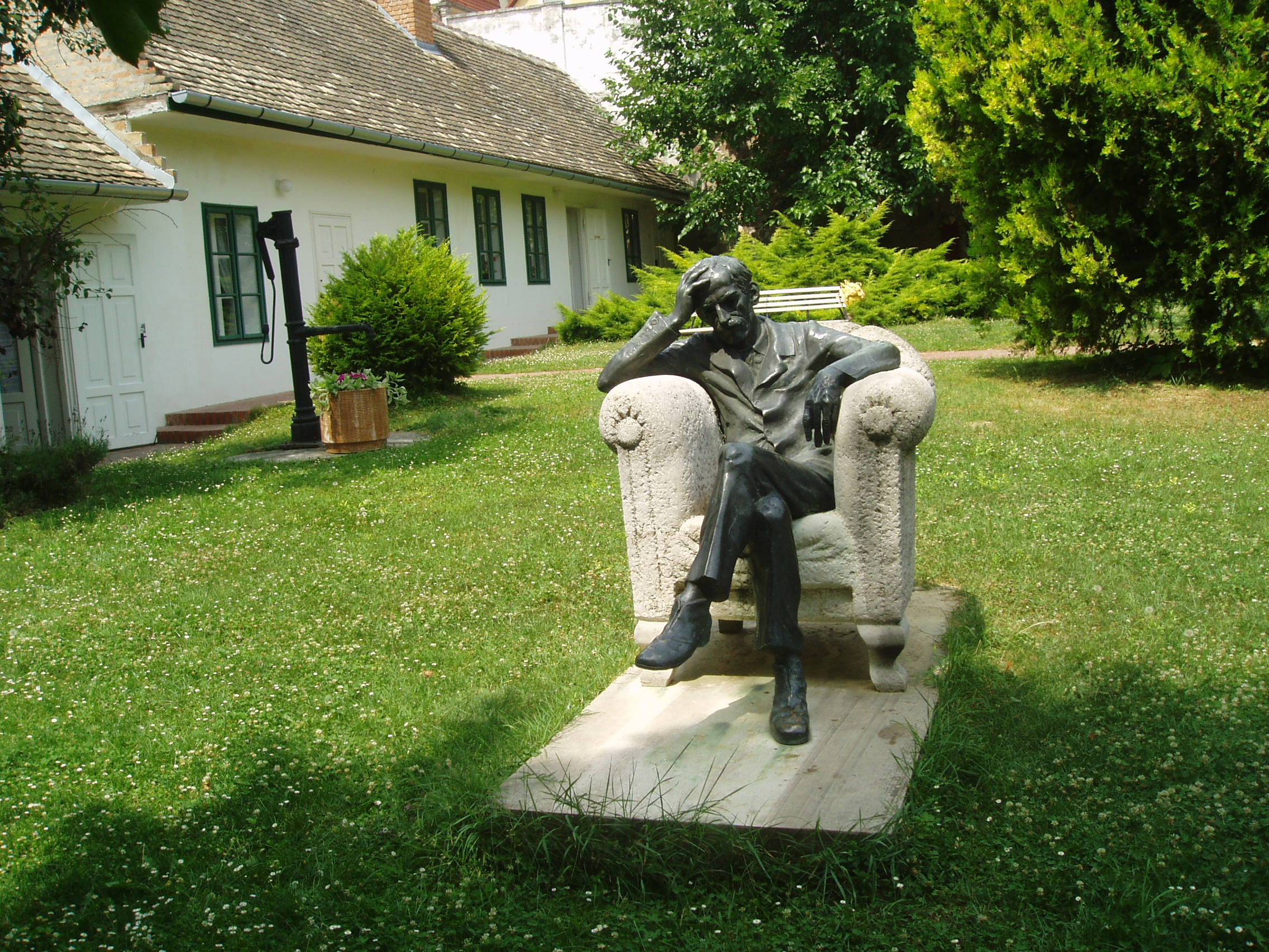 Nyilvános 1623 | 3642 | Szekszárd, Babits Mihály utca 13. Babits Mihály Emlékház | Babits Mihály egyemeletes, copf stílusú szülőháza a XIX. század elején (egyes források szerint 1780 körül) épült az akkor a város védőszentjéről Szt. Lászlónak nevezett utcában. A költő anyai nagyapja 1852-ben, szekszárdi letelepedésekor vásárolta meg. Itt született a költő 1883. november 26-án, s sokat tartózkodott és alkotott ezen a helyen. 1967-ben rendezték meg a házban az első emlékkiállítást, amelyet 1983-ban, a költő születésének centenáriumán újjáalakítottak, s az egész épületet emlékháznak rendezték be. A költő relikviái, a család bútorai, használati tárgyai és dokumentumai mellett láthatók Farkas Pál, Rippl-Rónai József, Glatz Oszkár és Beck Ö. Fülöp Babitsot ábrázoló képzőművészeti alkotásai is. Babits Mihály számos verse itt született, és itt játszódik a Halálfiai című regény több fejezete is. Az épület udvarán 1981-ben avatták fel Babits Mihály szobrát, Farkas Pál alkotását. A töprengő költő szobra a szülőház elválaszthatatlan része lett. Babits szülőházában állandó kiállítás idézi a szintén szekszárdi születésű Dienes Valéria filozófus és Baka István költő, író emlékét. A fénykép 2006 júliusában készült. Felh. irod.: www.szekszard.hu www.museum.hu Töttős Gábor: Babits bölcsői körül. = Tolna Megyei Levéltári Füzetek 6. Szekszárd, 1977 |