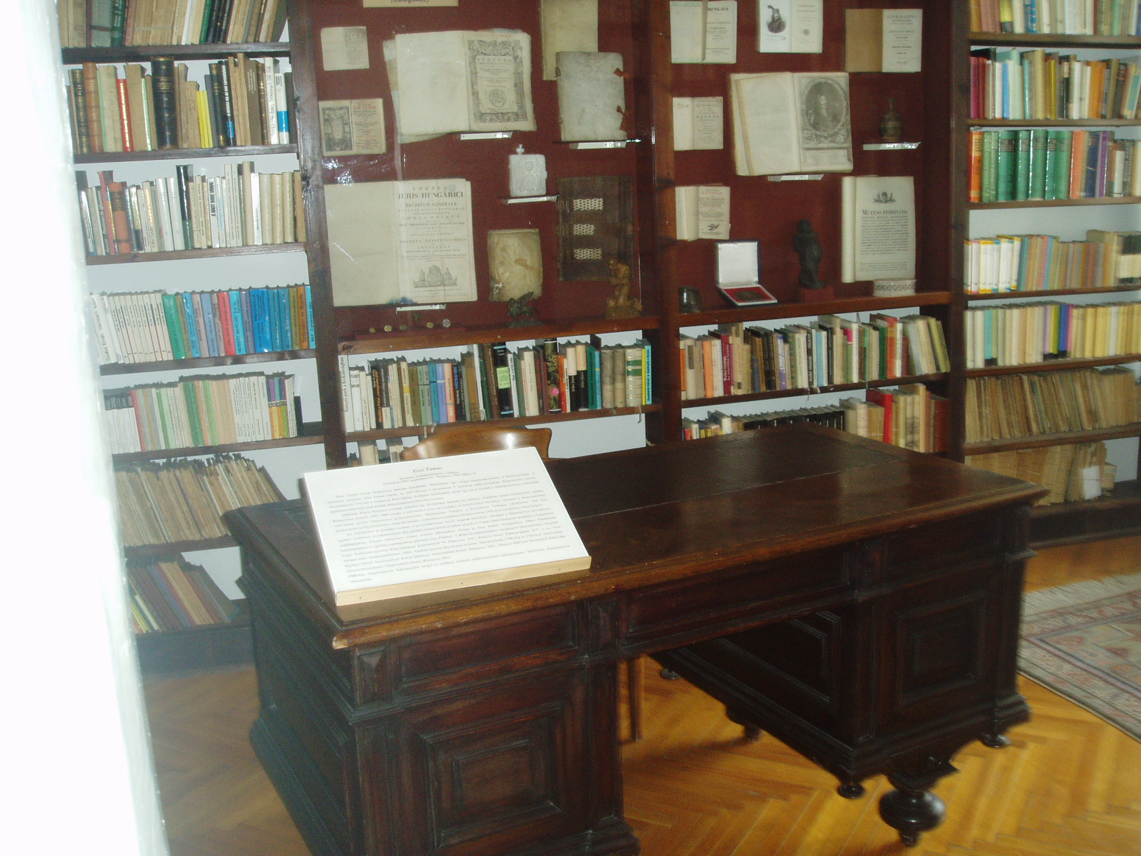 Nyilvános 1148 | 1869 | Szekszárd, Béla tér 1. Megyeháza | A szekszárdi Megyeházán rendezték be Esze Tamás történész emlékszobáját. Esze Tamás (Szekszárd, 1903 - Budapest, 1993) történész, irodalomtörténész, teológus. A kuruc brigadéros idősebb bátyjának, Mártonnak, egy tarpai bognármesternek a leszármazottja. 1930-ban Pápán avatták lelkésszé. A magyarországi református egyház tudományos gyűjteményének főigazgatója. Tanított a Református Teológiai Akadémián, több évig szerkesztette az Egyháztörténet című folyóiratot. Fő érdeklődési és kutatási területe a protestantizmus XVI-XVII. századi története, valamint a Rákóczi-kor társadalom-, egyház-, irodalom- és pénztörténete. 1988-ban életpályájának legfontosabb tárgyi és szellemi értékeit szülővárosának adományozta. A kiállításon a tudós szakkönyvtára és a Rákóczi Ferenc által Esze Tamás kuruc brigadérosnak adományozott nemesi armálisa látható. (Esze Tamás felesége volt Mattioni Eszter festőművész, akinek állandó kiállítása szintén a Megyeházán látható.) A fénykép 2006 júliusában készült. Felh. irod.: www.szekszard.hu |